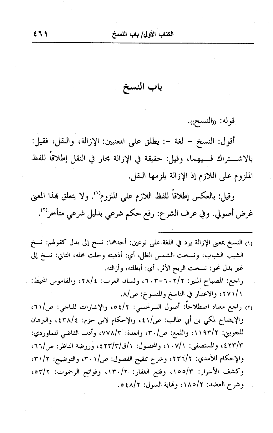 (١) النسخ بمعنى الإزالة يرد في اللغة على نوعين: أحدهما: نسخ إلى بدل كقولهم: نسخ الشيب الشباب، ونسخت الشمس الظل، أي: أذهبته وحلت محله، الثاني: نسخ إلى غير بدل نحو: نسخت الريح الأثر، أي: أبطلته، وأزالته.