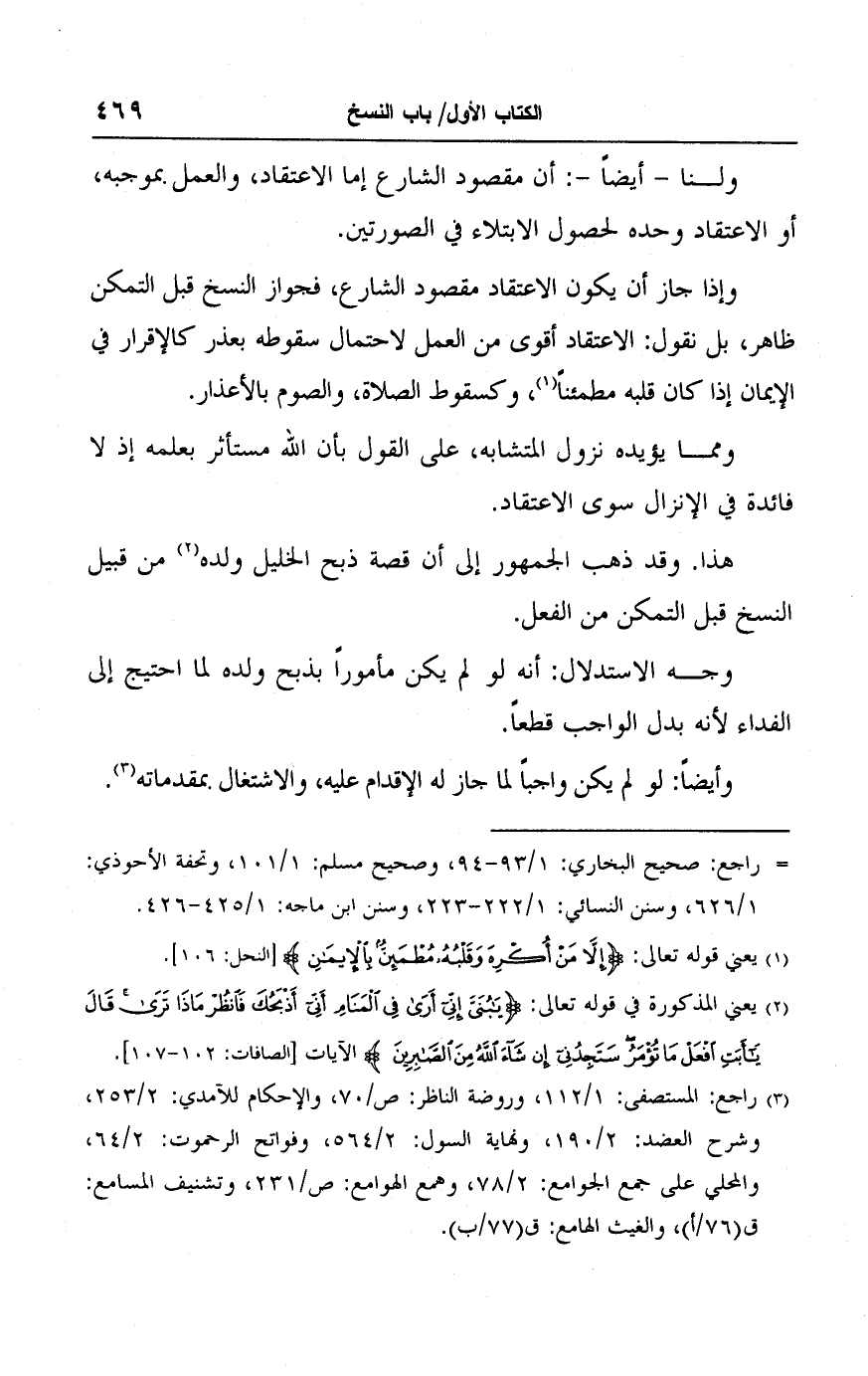 وإذا جاز أن يكون الاعتقاد مقصود الشارع، فجواز النسخ قبل التمكن ظاهر، بل نقول: الاعتقاد أقوى من العمل لاحتمال سقوطه بعذر كالإقرار في الإيمان إذا كان قلبه مطمئنًا (١)، وكسقوط الصلاة، والصوم بالأعذار.