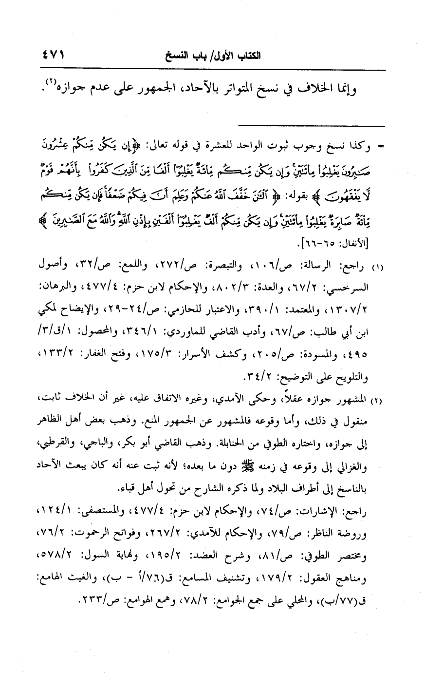 (١) راجع: الرسالة: ص/ ١٠٦، والتبصرة: ص/ ٢٧٢، واللمع: ص/ ٣٢، وأصول السرخسي: ٢/ ٦٧، والعدة: ٣/ ٨٠٢، والإحكام لابن حزم: ٤/ ٤٧٧، والبرهان: ٢/ ١٣٠٧، والمعتمد: ١/ ٣٩٠، والاعتبار للحازمي: ص/ ٢٤ - ٢٩، والإيضاح لمكي بن أبي طالب: ص/ ٦٧، وأدب القاضي للماوردي: ١/ ٣٤٦، والمحصول: ١/ ق/ ٣/ ٤٩٥، والمسودة: ص/ ٢٠٥، وكشف الأسرار: ٣/ ١٧٥، وفتح الغفار: ٢/ ١٣٣، والتلويح على التوضيح: ٢/ ٣٤.