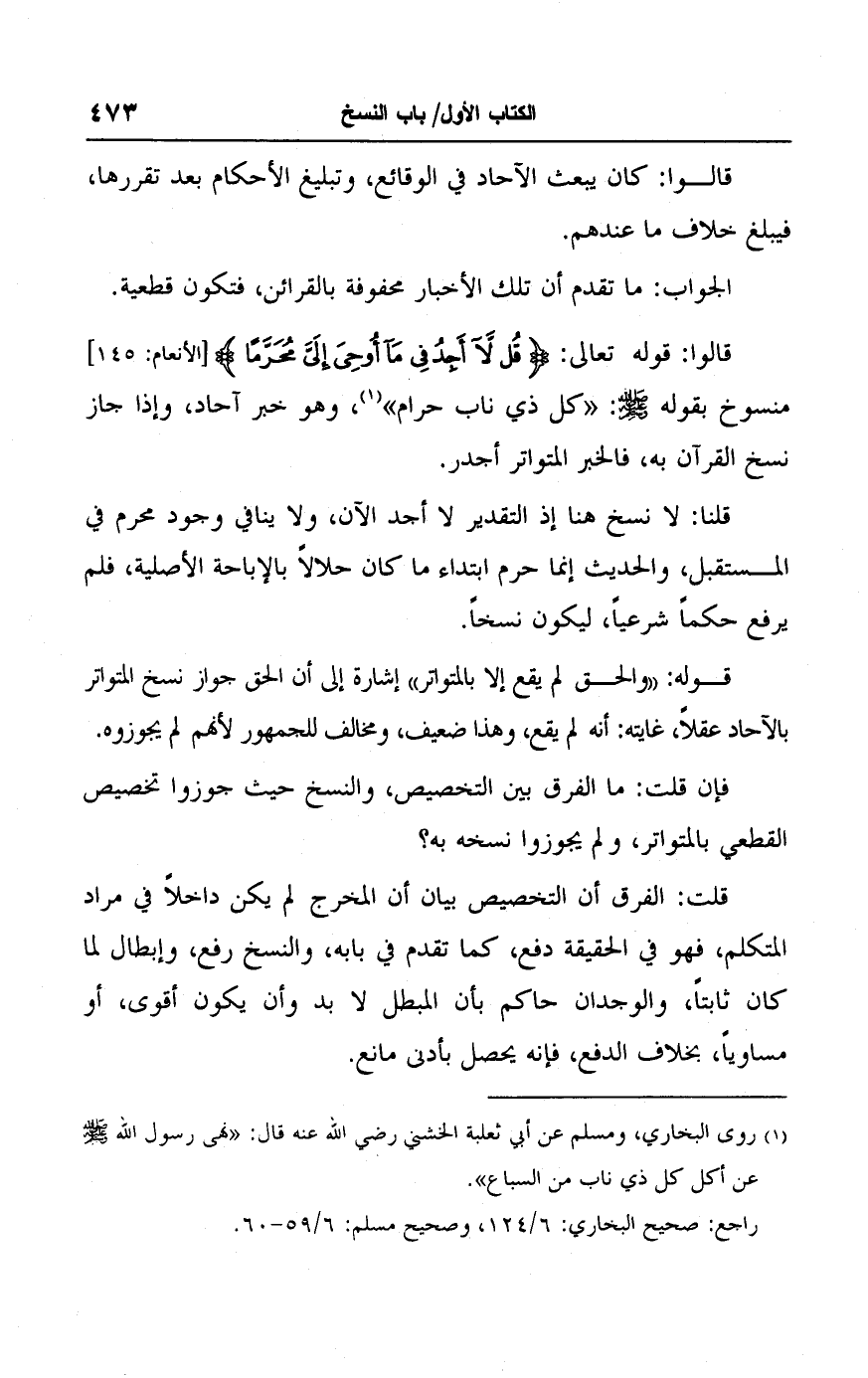 قالوا: قوله تعالى: {قُلْ لَا أَجِدُ فِي مَا أُوحِيَ إِلَيَّ مُحَرَّمًا} [الأنعام: ١٤٥] منسوخ بقوله - صلى الله عليه وسلم -: "كل ذي ناب حرام" (١)، وهو خبر آحاد، وإذا جاز نسخ القرآن به، فالخبر المتواتر أجدر.