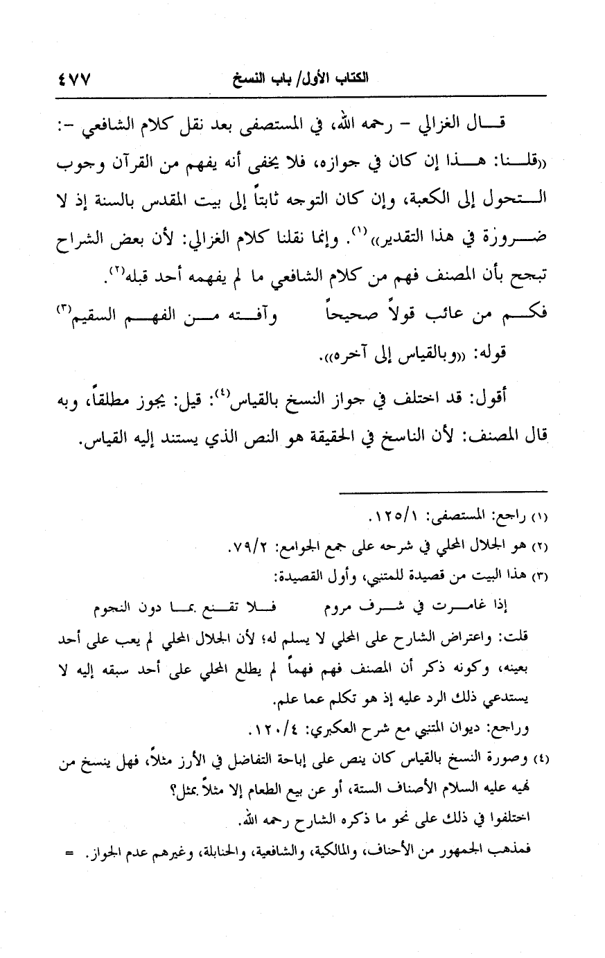 قال الغزالي - رحمه الله، في المستصفى بعد نقل كلام الشافعي -: "قلنا: هذا إن كان في جوازه، فلا يخفى أنه يفهم من القرآن وجوب التحول إلى الكعبة، وإن كان التوجه ثابتًا إلى بيت المقدس بالسنة إذ لا ضرورة في هذا التقدير" (١). وإنما نقلنا كلام الغزالي: لأن بعض الشراح تبجح بأن المصنف فهم من كلام الشافعي ما لم يفهمه أحد قبله (٢).