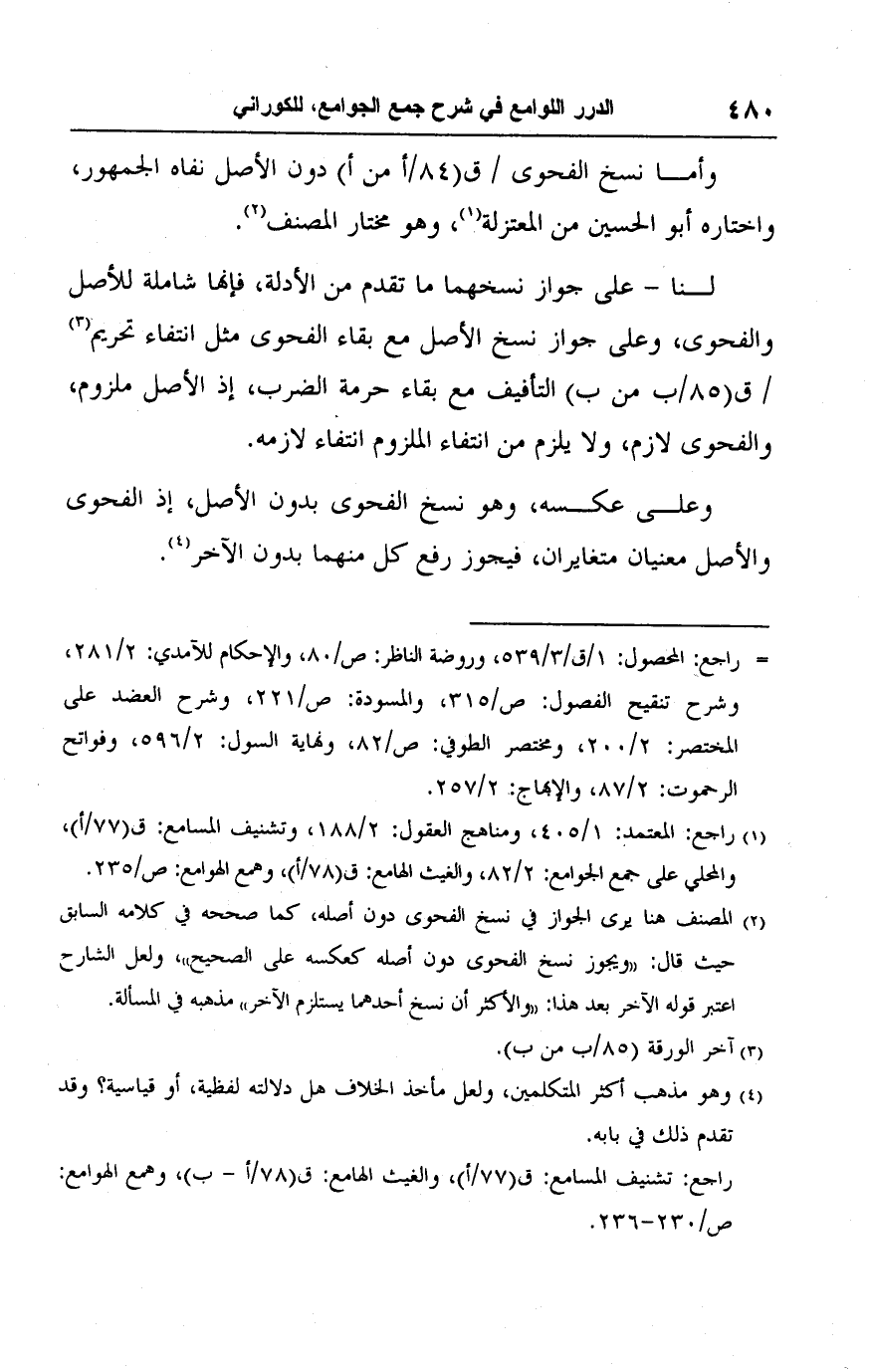 وأما نسخ الفحوى/ ق (٨٤/ أمن أ) دون الأصل نفاه الجمهور، واختاره أبو الحسين من المعتزلة (١)، وهو مختار المصنف (٢).