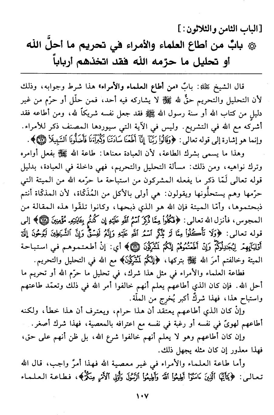قال الشيخ رحمه الله: بابٌ "من أطاع العلماء والأمراء" هذا شرط وجوابه، وذلك لأن التحليل والتحريم حقٌّ لله سبحانه وتعالى لا يشاركه فيه أحد، فمن حلّل أو حرّم من غير دليلٍ من كتاب الله أو سنة رسول الله صَلَّى اللَّهُ عَلَيْهِ وَسَلَّمَ فقد جعل نفسه شريكاً لله، ومن أطاعه فقد أشركه مع الله في التشريع. وليس في الآية التي سيوردها المصنف ذكر للأمراء. وإنما هو إشارة إلى قوله تعالى: {وَقَالُوا رَبَّنَا إِنَّا أَطَعْنَا سَادَتَنَا وَكُبَرَاءَنَا فَأَضَلُّونَا السَّبِيلا (67) } .