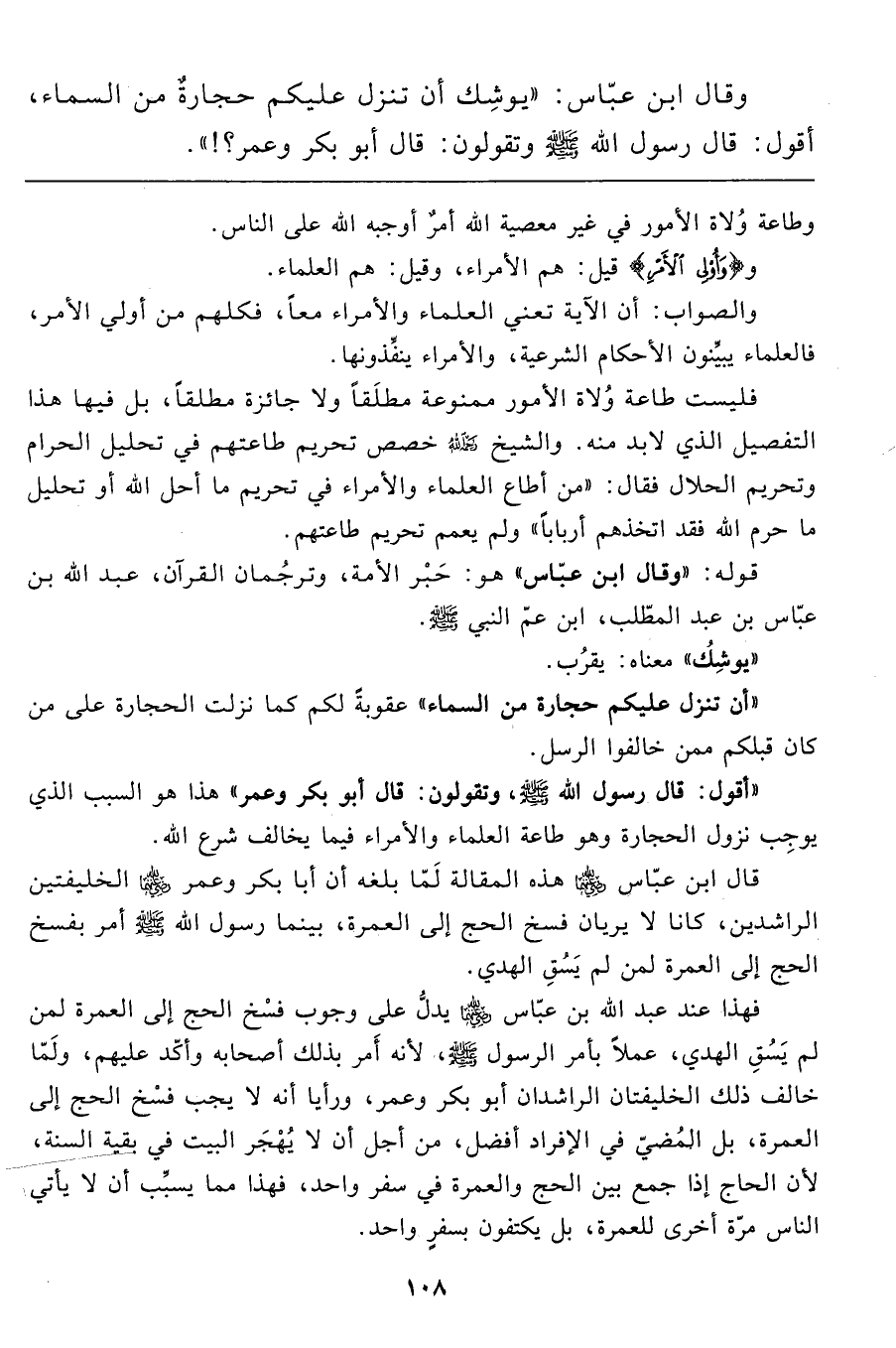 فهذا عند عبد الله بن عبّاس رضي الله عنهما يدلُّ على وجوب فسْخ الحج إلى العمرة لمن لم يَسُقِ الهدي، عملاً بأمر الرسول صَلَّى اللَّهُ عَلَيْهِ وَسَلَّمَ، لأنه أمر بذلك أصحابه وأكّد عليهم، ولَمّا خالف ذلك الخليفتان الراشدان أبو بكر وعمر، ورأيا أنه لا يجب فسْخ الحج إلى العمرة، بل المُضي في الإفراد أفضل، من أجل أن لا يُهْجَر البيت في بقية السنّة، لأن الحاج إذا جمع بين الحج والعمرة في سفر واحد، فهذا مما يسبِّب أن لا يأتي الناس مّرة أخرى للعمرة، بل يكتفون بسفرٍ واحد.