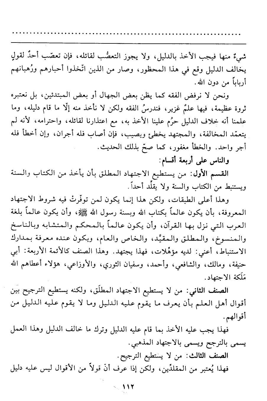 القسم الأول: من يستطيع الاجتهاد المطلق بأن يأخذ من الكتاب والسنّة ويستنبط من الكتاب والسنّة ولا يقلِّد أحداً.