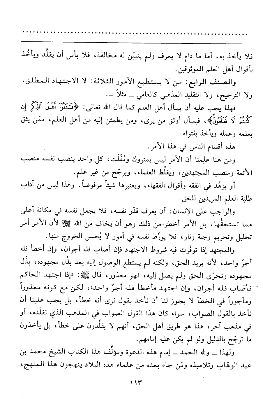 ولهذا- ولله الحمد- إمام هذه الدعوة ومؤلِّف هذا الكتاب الشيخ محمد بن عبد الوهّاب وتلاميذه ومَن جاء بعده من علماء هذه البلاد ينهجون هذا المنهج،