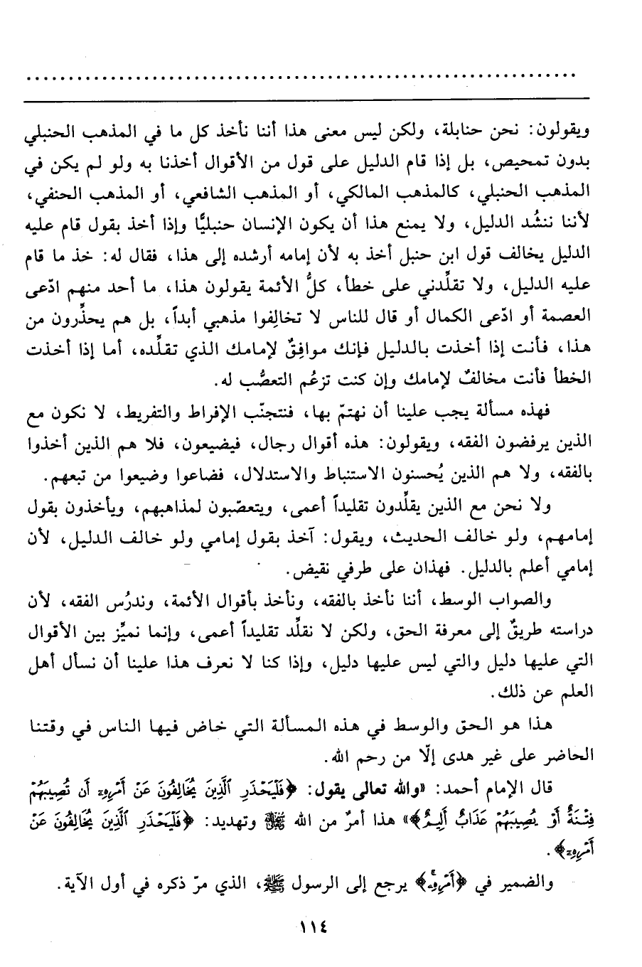 ويقولون: نحن حنابلة، ولكن ليس معنى هذا أننا نأخذ كل ما في المذهب الحنبلي بدون تمحيص، بل إذا قام الدليل على قول من الأقوال أخذنا به ولو لم يكن في المذهب الحنبلي، كالمذهب المالكي، أو المذهب الشافعي، أو المذهب الحنفي، لأننا ننشُد الدليل، ولا يمنع هذا أن يكون الإنسان حنبليًّا وإذا أخذ بقول قام عليه الدليل يخالف قول ابن حنبل أخذ به لأن إمامه أرشده إلى هذا، فقال له: خذ ما قام عليه الدليل، ولا تقلِّدني على خطأ، كلُّ الأئمة يقولون هذا، ما أحد منهم ادّعى العصمة أو ادّعى الكمال أو قال للناس لا تخالِفوا مذهبي أبداً، بل هم يحذِّرون من هذا، فأنت إذا أخذت بالدليل فإنك موافِقٌ لإمامك الذي تقلِّده، أما إذا أخذت الخطأ فأنت مخالفٌ لإمامك وإن كنت تزعُم التعصُّب له.