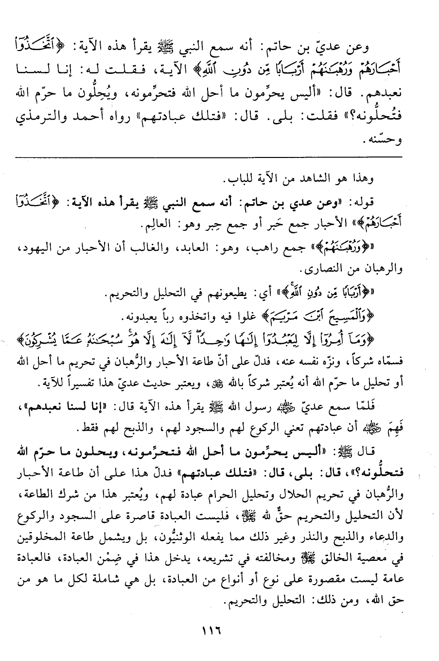 {وَمَا أُمِرُوا إِلَّا لِيَعْبُدُوا إِلَهاً وَاحِداً لا إِلَهَ إِلَّا هُوَ سُبْحَانَهُ عَمَّا يُشْرِكُونَ} فسمّاه شركاً، ونزّه نفسه عنه، فدلّ على أنّ طاعة الأحبار والرُّهبان في تحريم ما أحل الله أو تحليل ما حرّم الله أنه يُعتبر شركاً بالله عزّ وجلّ، ويعتبر حديث عديّ هذا تفسيراً للآية.