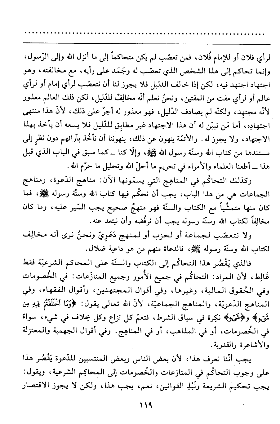 لرأي فلان أو للإمام فُلان، فمن تعصّب لم يكن متحاكماً إلى ما أنزل الله وإلى الرّسول، وإنما تحاكم إلى هذا الشخص الذي تعصّب له وجَمَد على رأيه، مع مخالفته، وهو اجتهاد اجتهد فيه، لكن إذا خالف الدليل فلا يجوز لنا أن نتعصّب لرأي إمام أو لرأي عالم أو لرأي مفت من المفتين، ونحنُ نعلم أنّه مخالِفٌ للدّليل، لكن ذلك العالم معذور لأنّه مجتهِد، ولكنّه لم يصادف الدّليل، فهو معذور له أجرٌ على ذلك، لأنّ هذا منتهى اجتهادِه، أما مَن تبيّن له أن هذا الاجتهاد غير مطابِق للدّليل فلا يسعه أن يأخذ بهذا الاجتهاد، ولا يجوز له. والأئمّة ينهون عن ذلك، ينهوننا أن نأخُذ بآرائهم دون نظرٍ إلى مستندها من كتاب الله وسنّة رسول الله صَلَّى اللَّهُ عَلَيْهِ وَسَلَّمَ، وإلاّ كنا- كما سبق في الباب الذي قبل هذا- أطعنا العلماء والأمراء في تحريم ما أحلّ الله وتحليل ما حرّم الله.