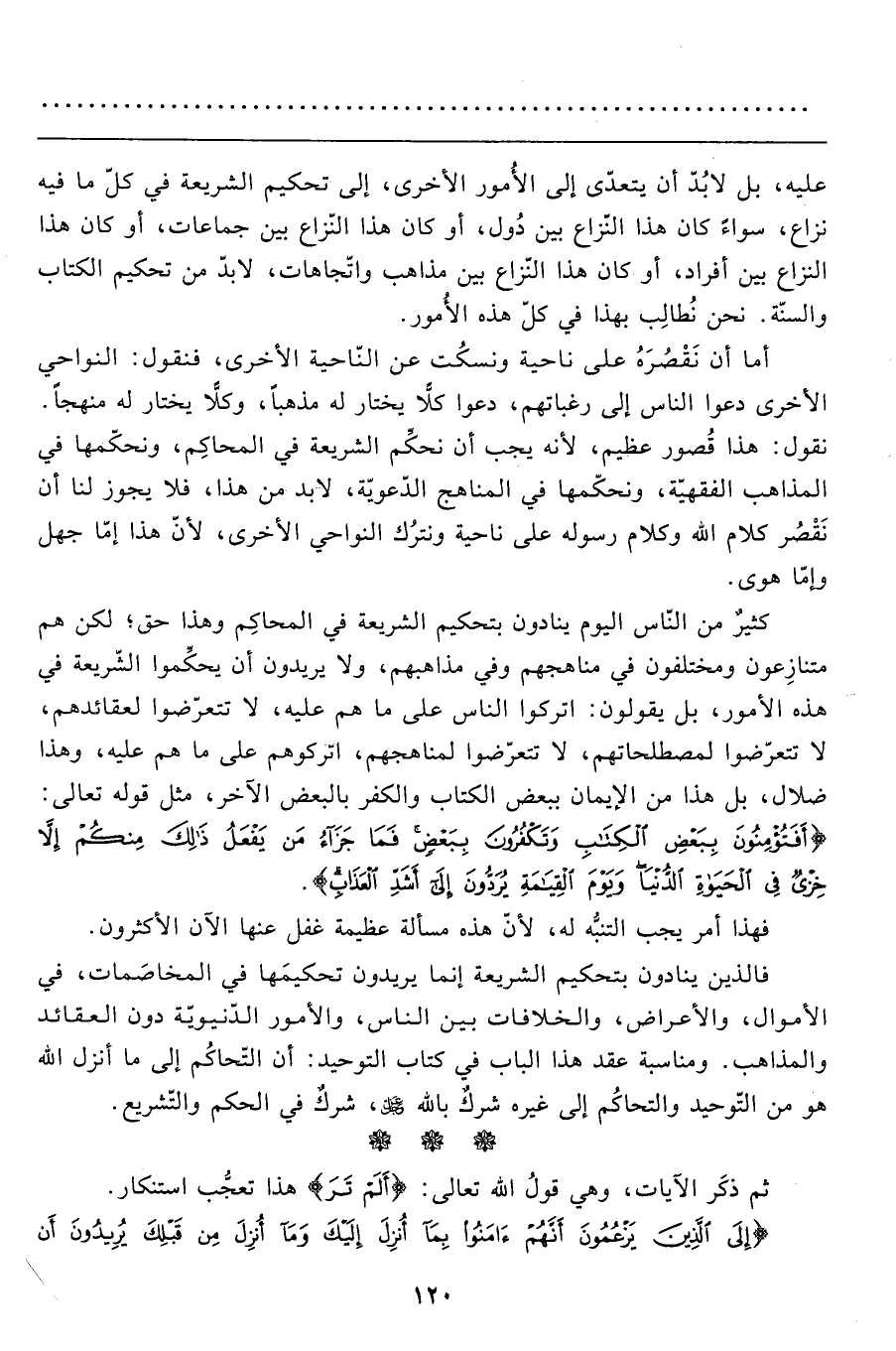 عليه، بل لابُدّ أن يتعدّى إلى الأُمور الأخرى، إلى تحكيم الشريعة في كلّ ما فيه نزاع، سواءً كان هذا النّزاع بين دُول، أو كان هذا النّزاع بين جماعات، أو كان هذا النزاع بين أفراد، أو كان هذا النّزاع بين مذاهب واتّجاهات، لابدّ من تحكيم الكتاب والسنّة. نحن نُطالِب بهذا في كلّ هذه الأُمور.
