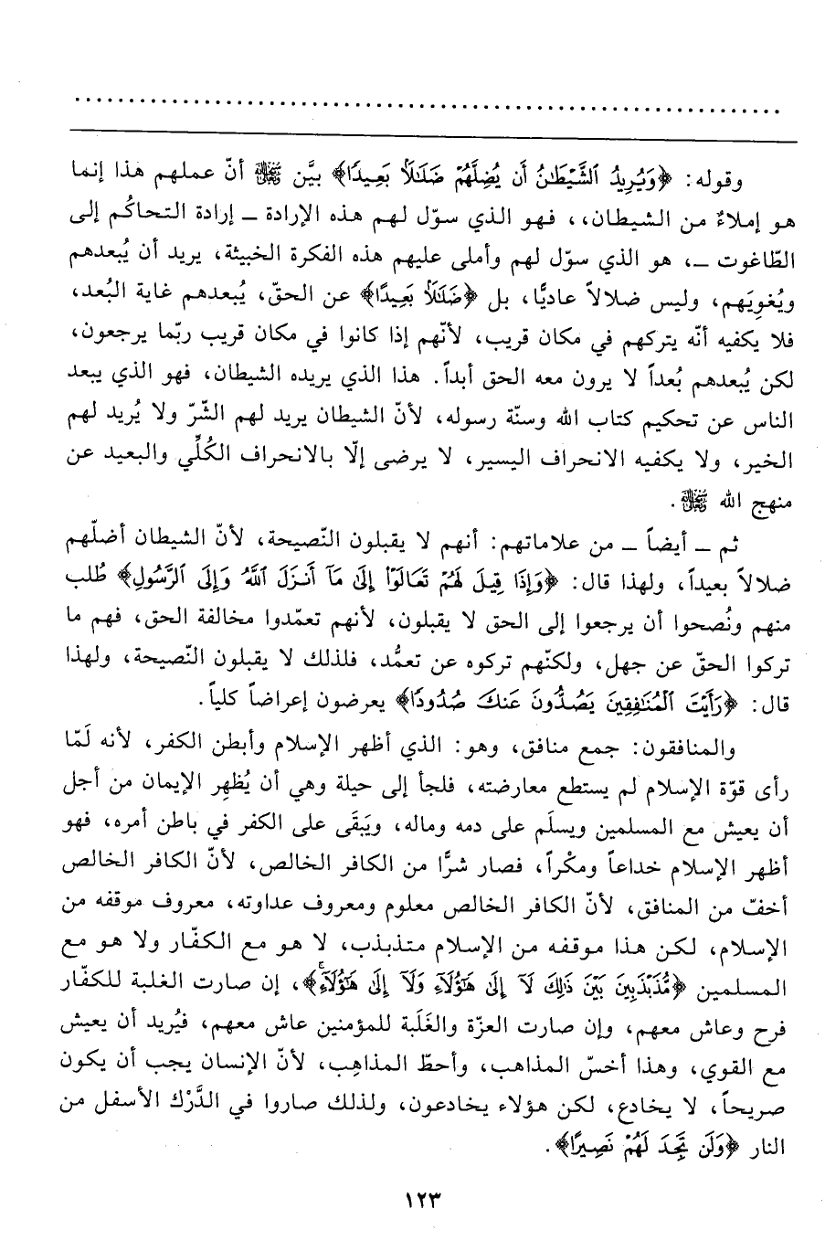 ثم- أيضاً- من علاماتهم: أنهم لا يقبلون النّصيحة، لأنّ الشيطان أضلّهم ضلالاً بعيداً، ولهذا قال: {وَإِذَا قِيلَ لَهُمْ تَعَالَوْا إِلَى مَا أَنْزَلَ اللهُ وَإِلَى الرَّسُولِ} طُلب منهم ونُصحوا أن يرجعوا إلى الحق لا يقبلون، لأنهم تعمّدوا مخالفة الحق، فهم ما تركوا الحقّ عن جهل، ولكنّهم تركوه عن تعمُّد، فلذلك لا يقبلون النّصيحة، ولهذا قال: {رَأَيْتَ الْمُنَافِقِينَ يَصُدُّونَ عَنْكَ صُدُوداً} يعرضون إعراضاً كلياً.