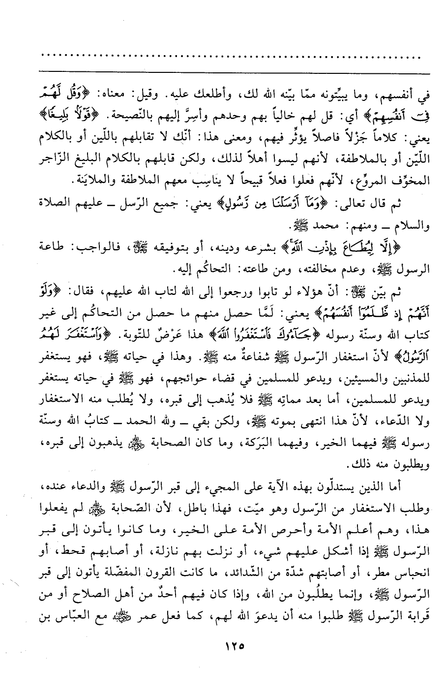 أما الذين يستدلّون بهذه الآية على المجيء إلى قبر الرّسول صَلَّى اللَّهُ عَلَيْهِ وَسَلَّمَ والدعاء عنده، وطلب الاستغفار من الرّسول وهو ميّت، فهذا باطل، لأن الصّحابة رضي الله عنهم لم يفعلوا هذا، وهم أعلم الأمة وأحرص الأمة على الخير، وما كانوا يأتون إلى قبر الرّسول صَلَّى اللَّهُ عَلَيْهِ وَسَلَّمَ إذا أشكل عليهم شيء، أو نزلت بهم نازلة، أو أصابهم قحط، أو انحباس مطر، أو أصابتهم شدّة من الشّدائد، ما كانت القرون المفضّلة يأتون إلى قبر الرّسول صَلَّى اللَّهُ عَلَيْهِ وَسَلَّمَ، وإنما يطلُبون من الله، وإذا كان فيهم أحدٌ من أهل الصلاح أو من قَرابة الرّسول صَلَّى اللَّهُ عَلَيْهِ وَسَلَّمَ طلبوا منه أن يدعوَ الله لهم، كما فعل عمر رضي الله عنه مع العبّاس بن