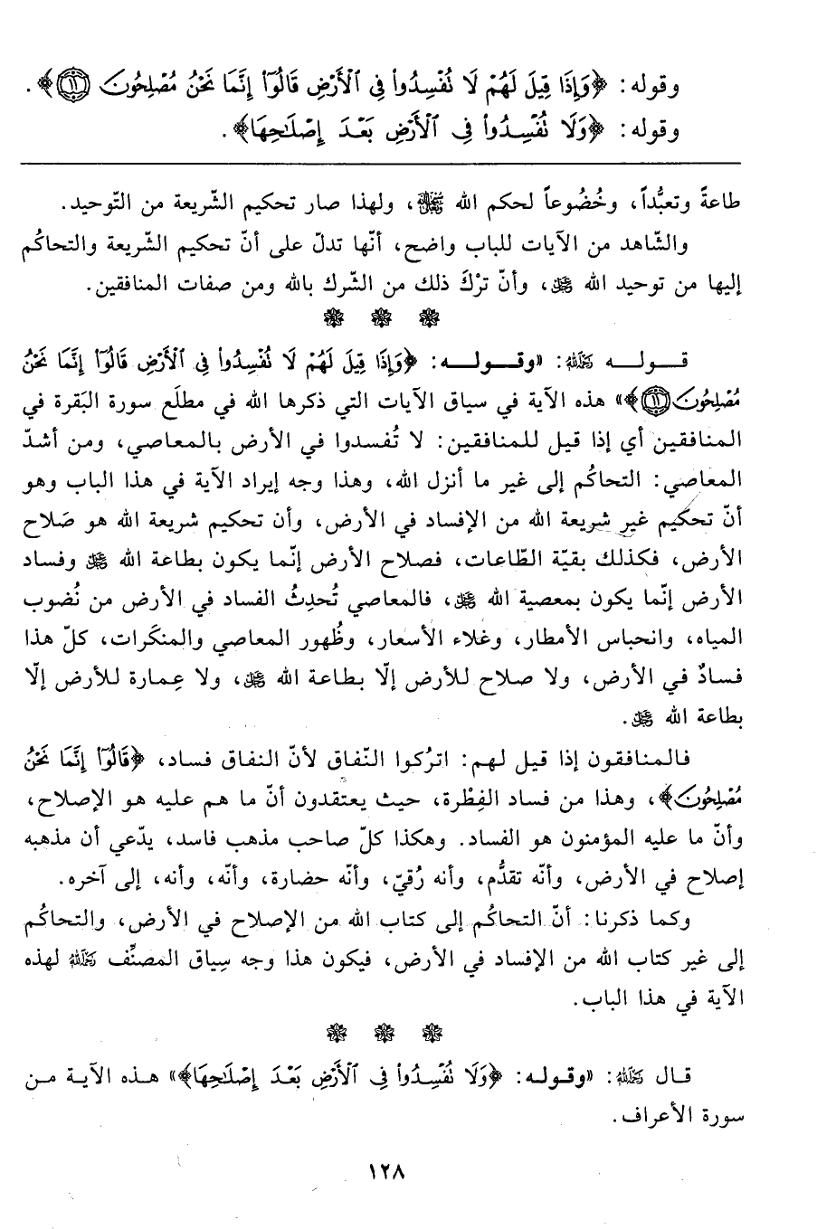 قوله رحمه الله: "وقوله: {وَإِذَا قِيلَ لَهُمْ لا تُفْسِدُوا فِي الْأَرْضِ قَالُوا إِنَّمَا نَحْنُ مُصْلِحُونَ (11) } " هذه الآية في سياق الآيات التي ذكرها الله في مطلَع سورة البَقرة في المنافقين أي إذا قيل للمنافقين: لا تُفسدوا في الأرض بالمعاصي، ومن أشدّ المعاصي: التحاكُم إلى غير ما أنزل الله، وهذا وجه إيراد الآية في هذا الباب وهو أنّ تحكيم غير شريعة الله من الإفساد في الأرض، وأن تحكيم شريعة الله هو صَلاح الأرض، فكذلك بقيّة الطّاعات، فصلاح الأرض إنّما يكون بطاعة الله عزّ وجلّ وفساد الأرض إنّما يكون بمعصية الله عزّ وجلّ، فالمعاصي تُحدِثُ الفساد في الأرض من نُضوب المياه، وانحباس الأمطار، وغلاء الأسعار، وظُهور المعاصي والمنكَرات، كلّ هذا فسادٌ في الأرض، ولا صلاح للأرض إلا بطاعة الله عزّ وجلّ، ولا عِمارة للأرض إلاّ بطاعة الله عزّ وجلّ.