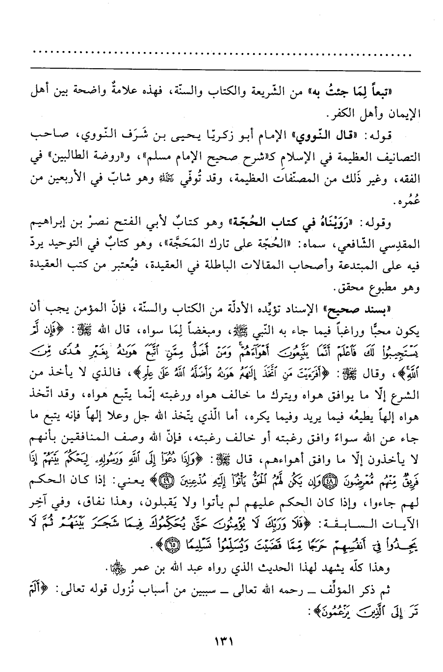 "بسند صحيح" الإسناد تؤيِّده الأدلّة من الكتاب والسنّة، فإنّ المؤمن يجب أن يكون محبًّا وراغباً فيما جاء به النبي صَلَّى اللَّهُ عَلَيْهِ وَسَلَّمَ، ومبغضاً لِمَا سواه، قال الله سبحانه وتعالى: {فَإِنْ لَمْ يَسْتَجِيبُوا لَكَ فَاعْلَمْ أَنَّمَا يَتَّبِعُونَ أَهْوَاءَهُمْ وَمَنْ أَضَلُّ مِمَّنِ اتَّبَعَ هَوَاهُ بِغَيْرِ هُدىً مِنَ اللهِ إِنَّ اللهَ} ، وقال سبحانه وتعالى: {أَفَرَأَيْتَ مَنِ اتَّخَذَ إِلَهَهُ هَوَاهُ وَأَضَلَّهُ اللهُ عَلَى عِلْمٍ} فالذي لا يأخذ من الشرع إلاّ ما يوافق هواه ويترك ما خالف هواه ورغبته إنَّما يتّبع هواه، وقد اتّخذ هواه إلهاً يطيعُه فيما يريد وفيما يكره، أما الذّي يتّخذ الله جل وعلا إلهاً فإنه يتبع ما جاء عن الله سواءً وافق رغبته أو خالف رغبته، فإنّ الله وصف المنافقين بأنهم لا يأخذون إلاّ ما وافق أهواءهم، قال صَلَّى اللَّهُ عَلَيْهِ وَسَلَّمَ: {وَإِذَا دُعُوا إِلَى اللهِ وَرَسُولِهِ لِيَحْكُمَ بَيْنَهُمْ إِذَا فَرِيقٌ مِنْهُمْ مُعْرِضُونَ (48) وَإِنْ يَكُنْ لَهُمُ الْحَقُّ يَأْتُوا إِلَيْهِ مُذْعِنِينَ (49) } يعني: إذا كان الحكم لهم جاءوا، وإذا كان الحكم عليهم لم يأتوا ولا يقبلون، وهذا نفاق، وفي آخر الآيات السابقة: {فَلا وَرَبِّكَ لا يُؤْمِنُونَ حَتَّى يُحَكِّمُوكَ فِيمَا شَجَرَ بَيْنَهُمْ ثُمَّ لا يَجِدُوا فِي أَنْفُسِهِمْ حَرَجاً مِمَّا قَضَيْتَ وَيُسَلِّمُوا تَسْلِيماً (65) } .