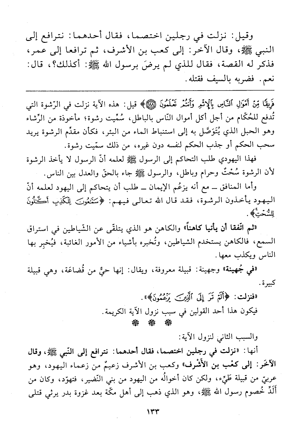 أنها: "نزلت في رجلين اختصما، فقال أحدهما: نترافع إلى النبي صَلَّى اللَّهُ عَلَيْهِ وَسَلَّمَ، وقال الآخَر: إلى كعْب بن الأَشْرف" وكعب بن الأشرف زعيمٌ من زعماء اليهود، وهو عربيّ من قبيلة طَيِّء، ولكن كان أخوالُه من اليهود من بني النّضير، فتهوّد، وكان من أَلَدِّ خُصوم رسول الله صَلَّى اللَّهُ عَلَيْهِ وَسَلَّمَ، وهو الذي ذهب إلى أهل مكّة بعد غزوة بدر يرثي قتلى