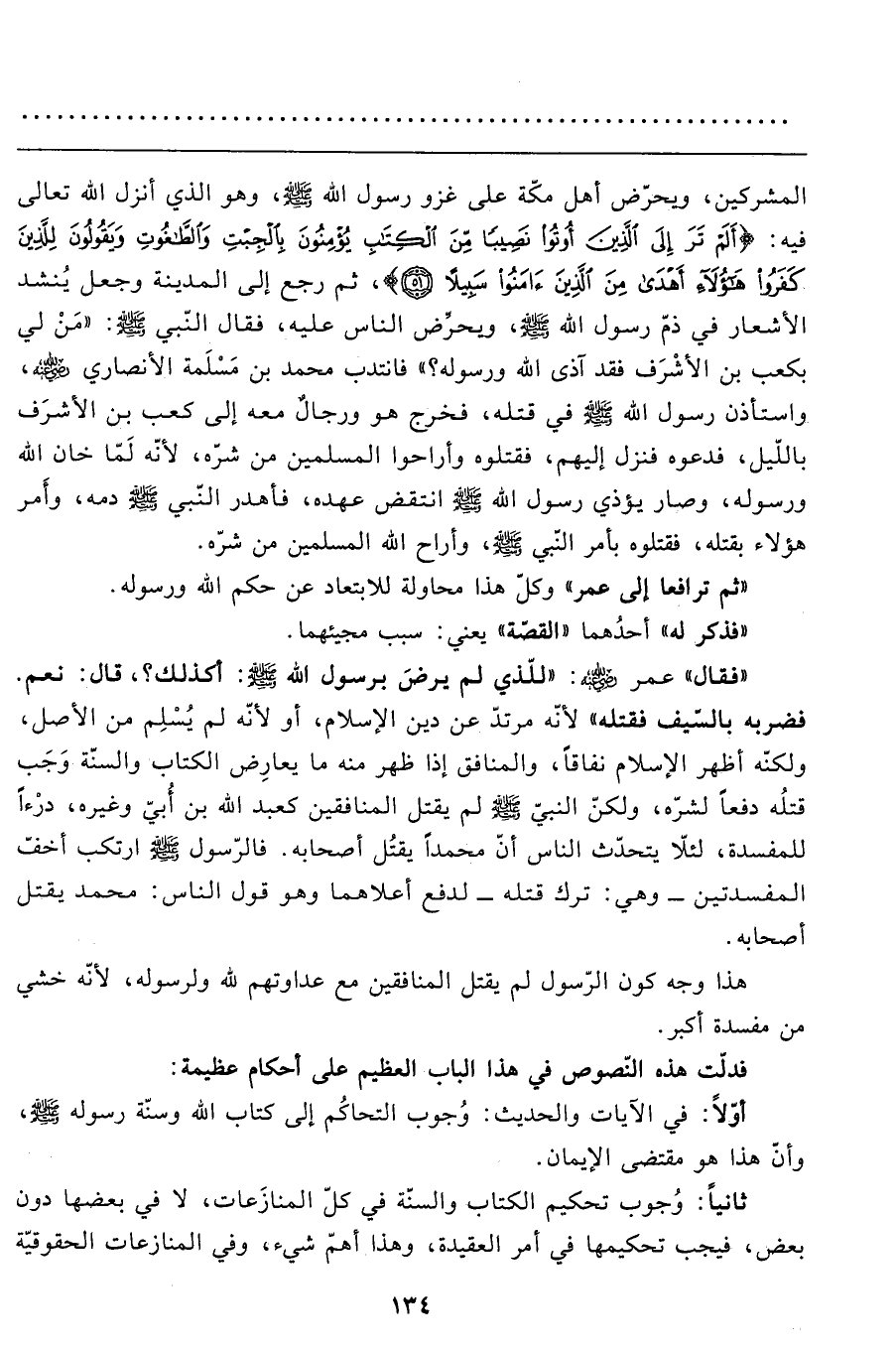 أوّلاً: في الآيات والحديث: وُجوب التحاكُم إلى كتاب الله وسنّة رسوله صَلَّى اللَّهُ عَلَيْهِ وَسَلَّمَ، وأنّ هذا هو مقتضى الإيمان.