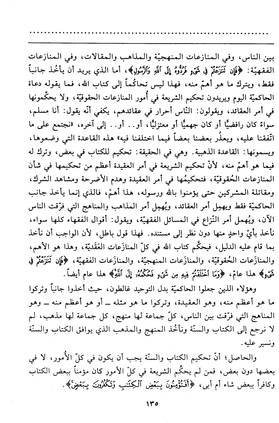 بين الناس، وفي المنازعات المنهجيّة والمذاهب والمقالات، وفي المنازعات الفقهية: {فَإِنْ تَنَازَعْتُمْ فِي شَيْءٍ فَرُدُّوهُ إِلَى اللهِ وَالرَّسُولِ} "، أما الذي يريد أن يأخُذ جانباً فقط، ويترك ما هو أهمّ منه، فهذا ليس تحاكُماً إلى كتاب الله، فما يقوله دعاة الحاكميّة اليوم ويريدون تحكيم الشريعة في أُمور المنازعات الحقوقيّة، ولا يحكِّمونها في أمر العقائد، ويقولون: النّاس أحرار في عقائدهم، يكفي أنّه يقول: أنا مسلم، سواءً كان رافضيّاً أو كان جهمياً أو معتزليّاً، أو.. أو.. إلى آخره، "نجتمع على ما اتفقنا عليه، ويعذُر بعضنا بعضاً فيما اختلفنا فيه" هذه القاعدة التي وضعوها، ويسمونها: القاعدة الذهبية. وهي في الحقيقة: تحكيم للكتاب في بعض، وترك له فيما هو أهمّ منه، لأنّ تحكيم الشريعة في أمر العقيدة أعظم من تحكيمها في شأن المنازعات الحُقوقية، فتحكيمُها في أمر العقيدة وهدم الأضرحة ومشاهد الشرك، ومقاتلة المشركين حتى يؤمنوا بالله ورسوله، هذا أهمّ، فالذي إنما يأخذ جانب الحاكميّة فقط ويُهمِل أمر العقائد، ويُهمِل أمر المذاهب والمناهج التي فرّقت الناس الآن، ويُهمل أمر النّزاع في المسائل الفقهيّة، ويقول: أقوال الفقهاء كلها سواء، نأخذ بأيّ واحدٍ منها دون نظر إلى مستنده. فهذا قول باطل، لأن الواجب أن نأخذ بما قام عليه الدليل، فيحكَّم كتاب الله في كلّ المنازَعات العَقَديّة، وهذا هو الأهم، والمنازَعات الحُقوقيّة، والمنازَعات المنهجيّة، والمنازَعات الفقهيّة، {فَإِنْ تَنَازَعْتُمْ فِي شَيْءٍ} هذا عامّ، {وَمَا اخْتَلَفْتُمْ فِيهِ مِنْ شَيْءٍ فَحُكْمُهُ إِلَى اللهِ ذَلِكُمُ اللهُ} هذا عام أيضاً.