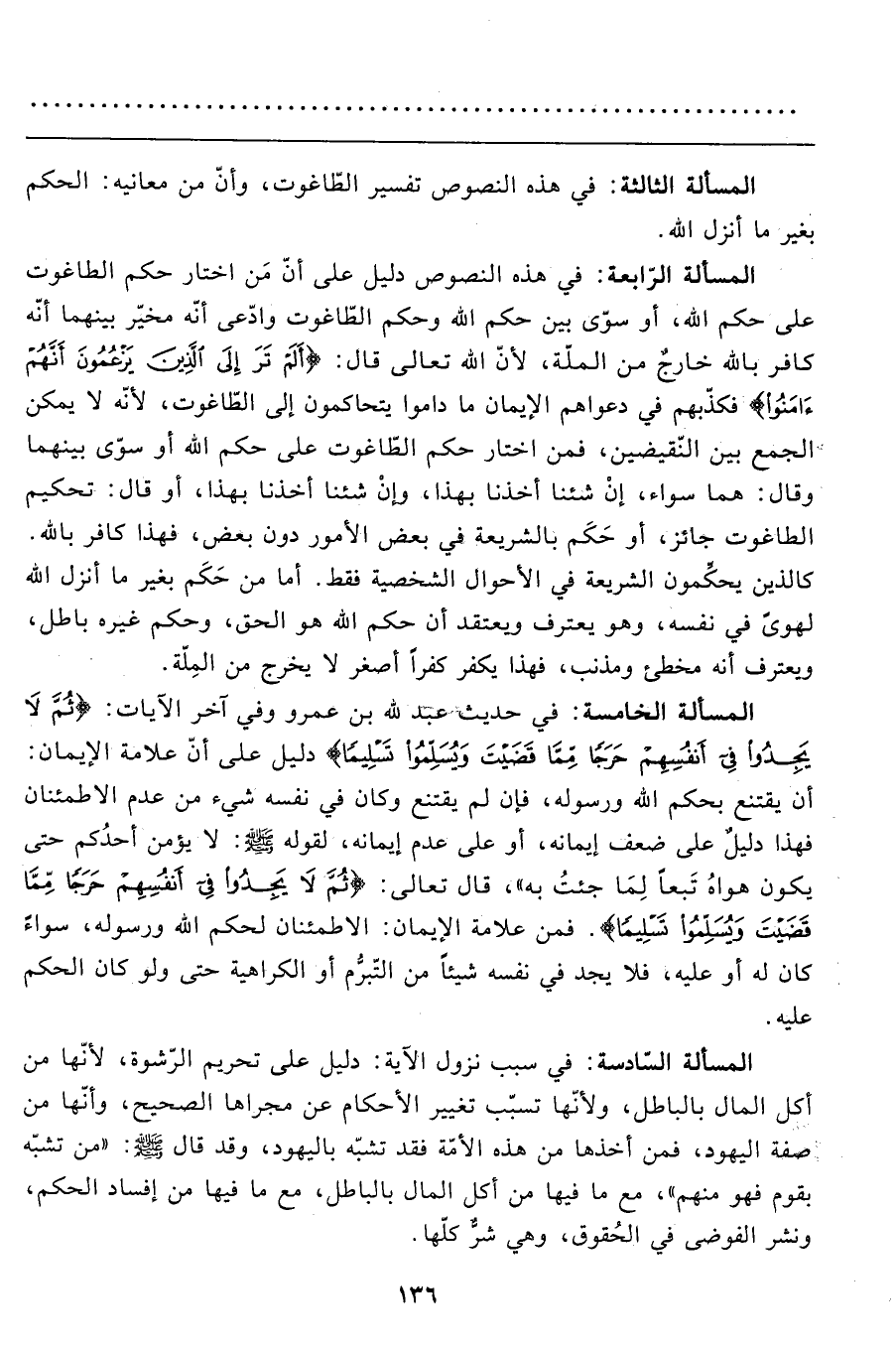 المسألة الخامسة: في حديث عبد لله بن عمرو وفي آخر الآيات: {ثُمَّ لا يَجِدُوا فِي أَنْفُسِهِمْ حَرَجاً مِمَّا قَضَيْتَ وَيُسَلِّمُوا تَسْلِيماً} دليل على أنّ علامة الإيمان: أن يقتنع بحكم الله ورسوله، فإن لم يقتنع وكان في نفسه شيء من عدم الاطمئنان فهذا دليلٌ على ضعف إيمانه، أو على عدم إيمانه، لقوله صَلَّى اللَّهُ عَلَيْهِ وَسَلَّمَ: "لا يؤمن أحدُكم حتى يكون هواهُ تَبعاً لِمَا جئتُ به"، قال تعالى: {ثُمَّ لا يَجِدُوا فِي أَنْفُسِهِمْ حَرَجاً مِمَّا قَضَيْتَ وَيُسَلِّمُوا تَسْلِيماً} . فمن علامة الإيمان: الاطمئنان لحكم الله ورسوله، سواءً كان له أو عليه، فلا يجد في نفسه شيئاً من التّبرُّم أو الكراهية حتى ولو كان الحكم عليه.