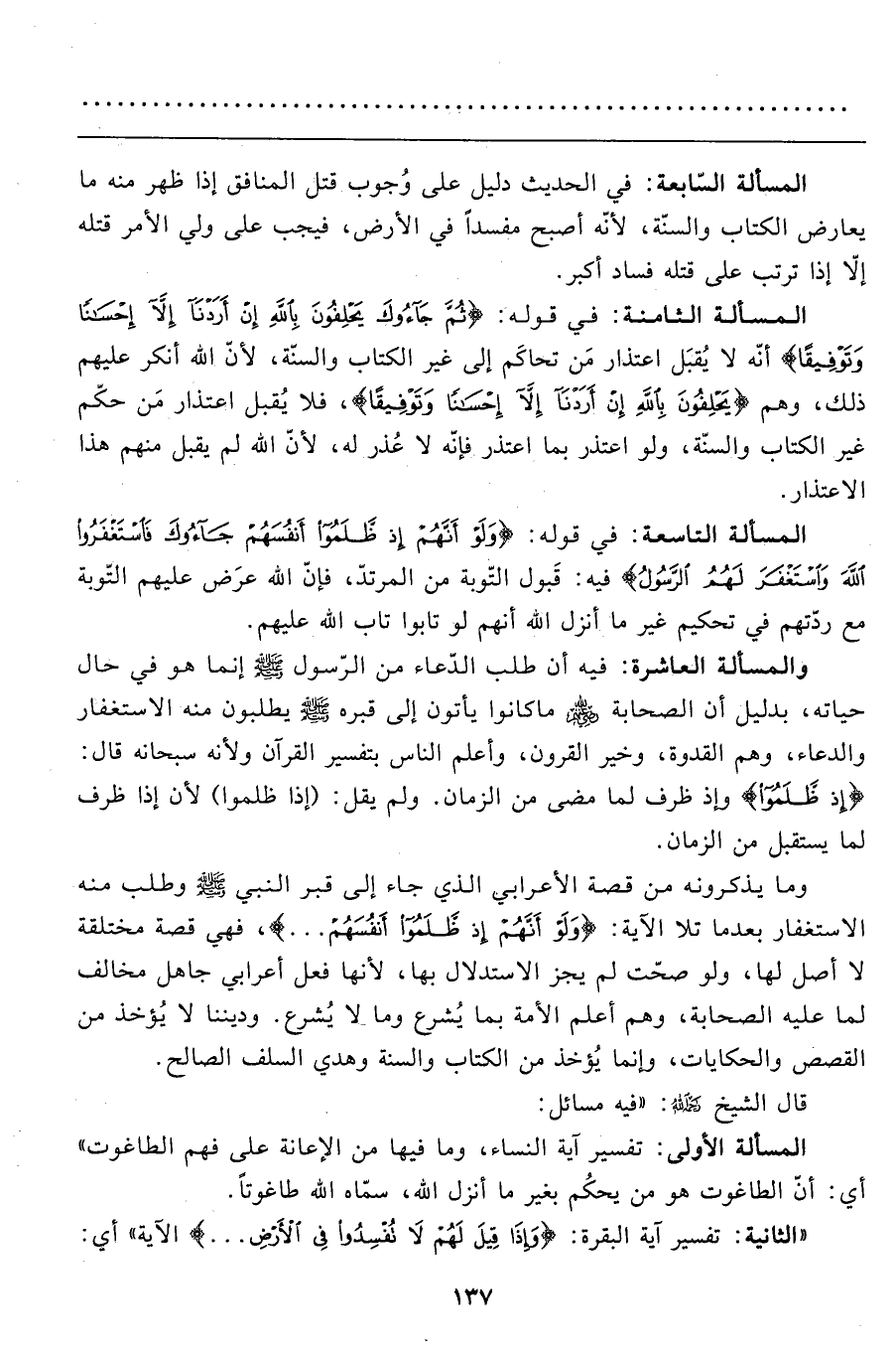 المسألة التاسعة: في قوله: {وَلَوْ أَنَّهُمْ إِذْ ظَلَمُوا أَنْفُسَهُمْ جَاءُوكَ فَاسْتَغْفَرُوا اللهَ وَاسْتَغْفَرَ لَهُمُ الرَّسُولُ} فيه: قَبول التّوبة من المرتدّ، فإنّ الله عرَض عليهم التّوبة مع ردّتهم في تحكيم غير ما أنزل الله أنهم لو تابوا تاب الله عليهم.
