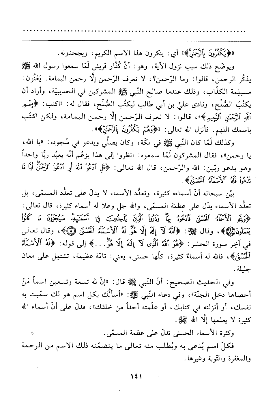 وكذلك لَمّا كان النّبي صَلَّى اللَّهُ عَلَيْهِ وَسَلَّمَ في مكّة، وكان يصلِّي ويدعو في سُجوده: "يا الله، يا رحمن"، فقال المشركون لَمّا سمعوه: انظروا إلى هذا يزعُم أنّه يعبُد ربًّا واحداً وهو يدعو ربّين: الله والرّحمن، قال الله تعالى: {قُلِ ادْعُوا اللهَ أَوِ ادْعُوا الرَّحْمَنَ أَيّاً مَا تَدْعُوا فَلَهُ الْأَسْمَاءُ الْحُسْنَى} .