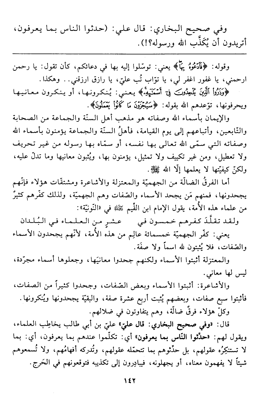 قال: "وفي صحيح البخاري: قال عليّ": علي بن أبي طالب يخاطِب العلماء، ويقول لهم: "حدِّثوا النّاس بما يعرفون" أي: تكلّموا عندهم بما يعرفون، أي: بما لا تستنكِرُه عقولهم، بل حدِّثوهم بما تتحمّله عقولهم، وتُدركه أفهامُهم، ولا تُسمعوهم شيئاً لا يفهمون معناه، أو يجهلونه، فيبادِرون إلى تكذيبه فتوقعونهم في الحَرج.
