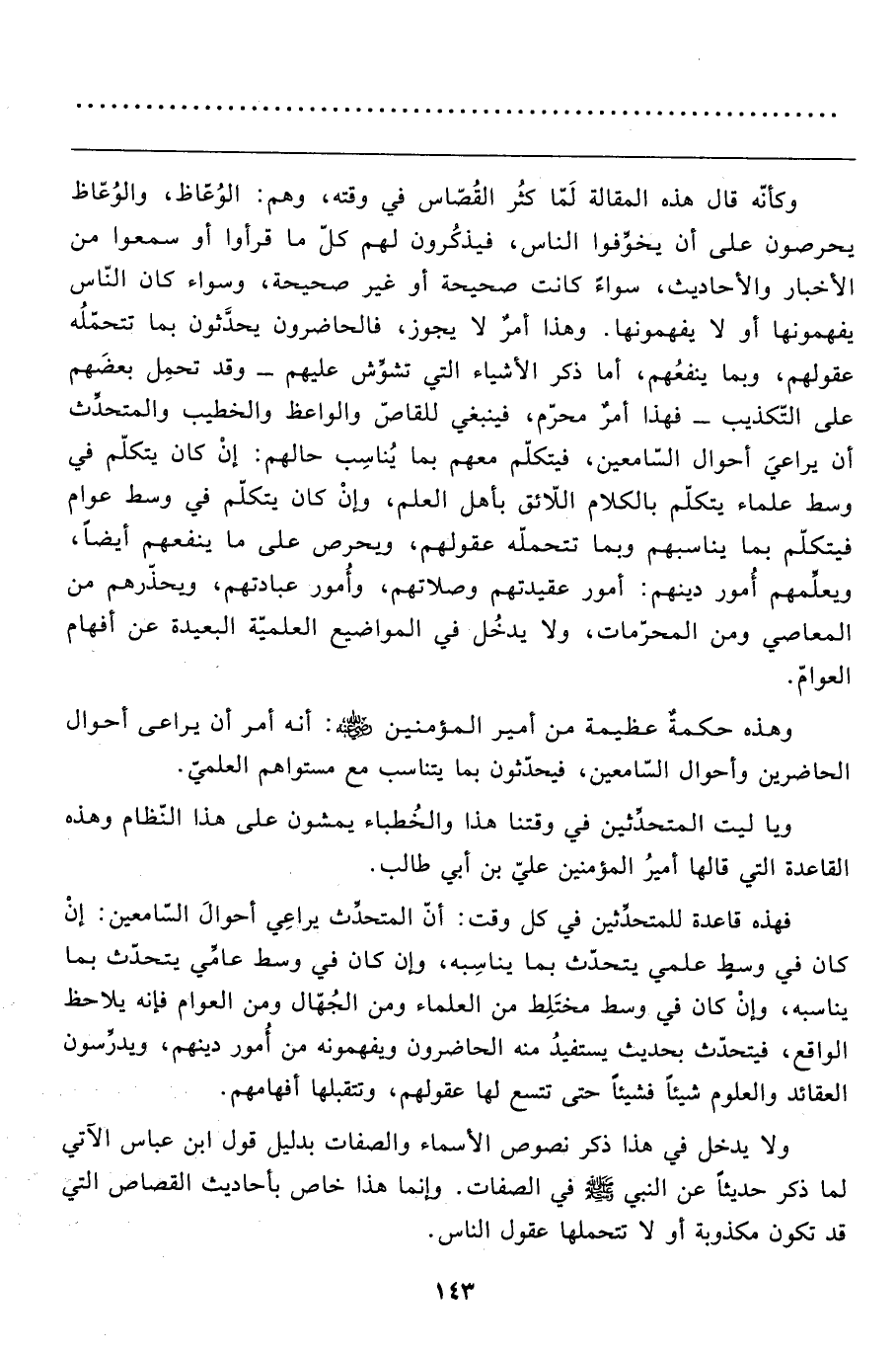 ولا يدخل في هذا ذكر نصوص الأسماء والصّفات بدليل قول ابن عباس الآتي لما ذكر حديثاً عن النبي صَلَّى اللَّهُ عَلَيْهِ وَسَلَّمَ في الصّفات. وإنما هذا خاص بأحاديث القصاص التي قد تكون مكذوبة أو لا تتحملها عقول الناس.