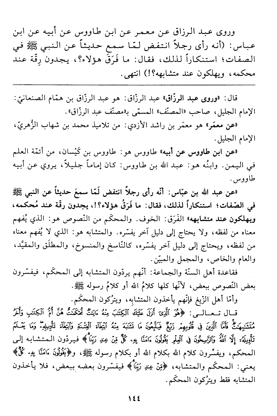 "عن عبد الله بن عبّاس: أنّه رأى رجلاً انتفض لَمّا سمعَ حديثاً عن النبي صَلَّى اللَّهُ عَلَيْهِ وَسَلَّمَ في الصّفات؛ استنكاراً لذلك، فقال: ما فَرَقُ هؤلاء؟!، يجدون رقّة عند مُحكمه، ويهلكون عند متشابهه" الفَرَق: الخوف. والمحكَم من النّصوص هو: الذي يُفهم معناه من لفظه، ولا يحتاج إلى دليل آخر يفسّره. والمتشابه هو: الذي لا يُفهم معناه من لفظه، ويحتاج إلى دليل آخر يفسّره، كالنّاسخ والمنسوخ، والمطلَق والمقيَّد، والعام والخاص، والمجمل والمبيّن.