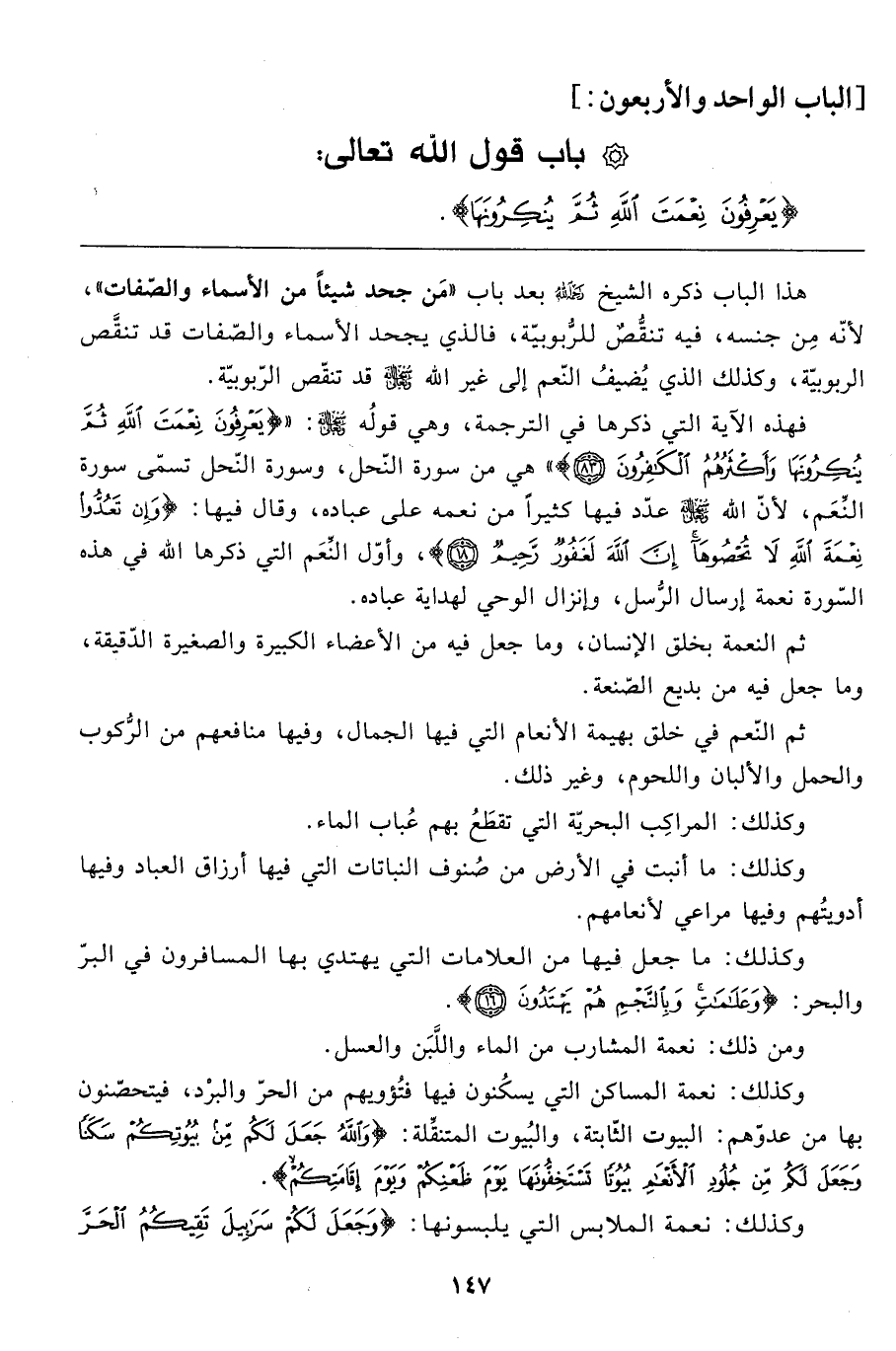 فهذه الآية التي ذكرها في الترجمة، وهي قولُه سبحانه وتعالى: " {يَعْرِفُونَ نِعْمَتَ اللهِ ثُمَّ يُنْكِرُونَهَا وَأَكْثَرُهُمُ الْكَافِرُونَ (83) } " هي من سورة النّحل، وسورة النّحل تسمّى سورة النِّعَم، لأنّ الله سبحانه وتعالى عدّد فيها كثيراً من نعمه على عباده، وقال فيها: {وَإِنْ تَعُدُّوا نِعْمَةَ اللهِ لا تُحْصُوهَا إِنَّ اللهَ لَغَفُورٌ رَحِيمٌ (18) } ، وأوّل النِّعمَ التي ذكرها الله في هذه السّورة نعمة إرسال الرُّسل، وإنزال الوحي لهداية عباده.