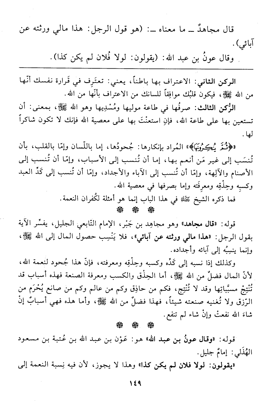 قوله: "قال مجاهد" وهو مجاهد بن جَبْر، الإمام التّابعي الجليل، يفسِّر الآية بقول الرجل: "هذا مالي ورثته عن آبائي"، فلا يَنْسب حصول المال إلى الله سبحانه وتعالى، وإنما ينسِبُه إلى آبائه وأجداده.
