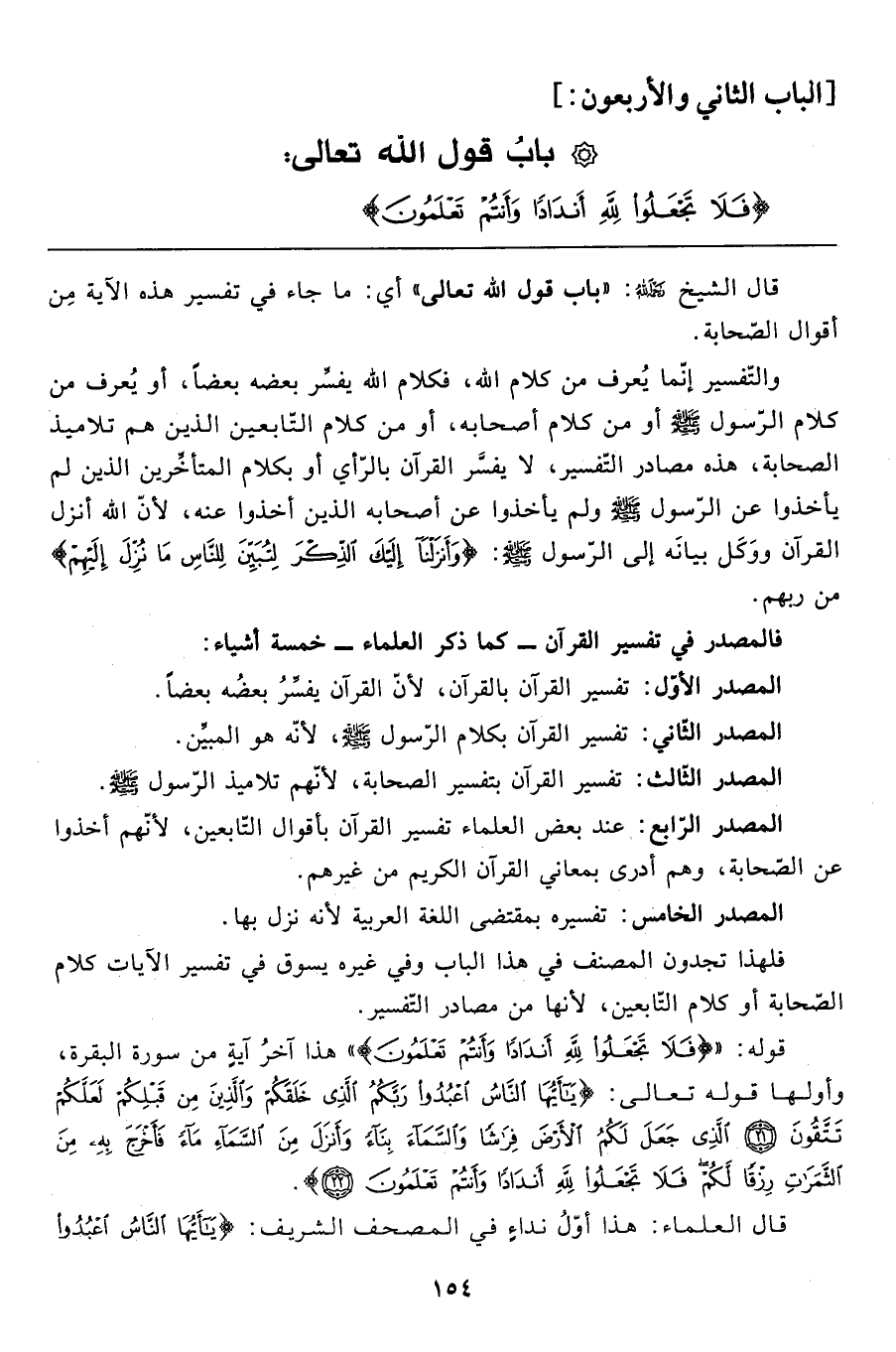 والتّفسير إنّما يُعرف من كلام الله، فكلام الله يفسِّر بعضه بعضاً، أو يُعرف من كلام الرّسول صَلَّى اللَّهُ عَلَيْهِ وَسَلَّمَ أو من كلام أصحابه، أو من كلام التّابعين الذين هم تلاميذ الصّحابة، هذه مصادر التّفسير، لا يفسِّر القرآن بالرأي أو بكلام المتأخِّرين الذين لم يأخذوا عن الرسول صَلَّى اللَّهُ عَلَيْهِ وَسَلَّمَ ولم يأخذوا عن أصحابه الذين أخذوا عنه، لأنّ الله أنزل القرآن ووَكَل بيانَه إلى الرّسول صَلَّى اللَّهُ عَلَيْهِ وَسَلَّمَ: {وَأَنْزَلْنَا إِلَيْكَ الذِّكْرَ لِتُبَيِّنَ لِلنَّاسِ مَا نُزِّلَ إِلَيْهِمْ} من ربهم.