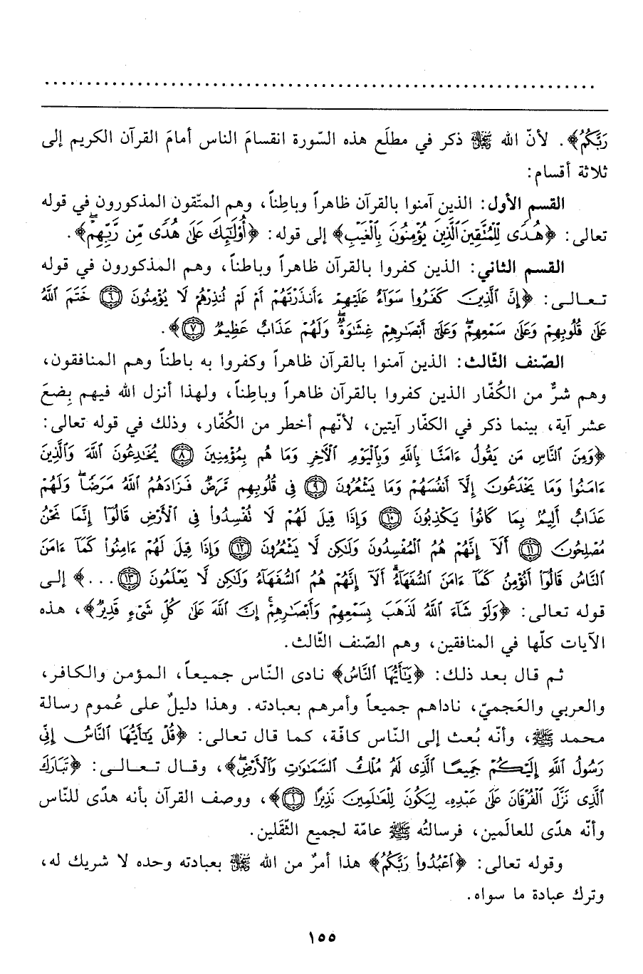 رَبَّكُمُ} . لأنّ الله سبحانه وتعالى ذكر في مطلَع هذه السّورة انقسامَ النّاس أمامَ القرآن الكريم إلى ثلاثة أقسام: