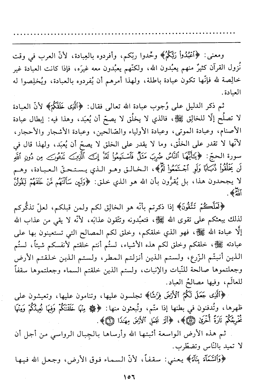 ثم ذكر الدليل على وُجوب عبادة الله تعالى فقال: {الَّذِي خَلَقَكُمْ} لأنّ العبادة لا تصلُح إلا للخالِق سبحانه وتعالى، فالذي لا يخلُق لا يصحّ أن يُعبَد، وهذا فيه: إبطال عبادة الأصنام، وعبادة الموتى، وعبادة الأولياء والصّالحين، وعبادة الأشجار والأحجار، لأنّها لا تقدر على الخلْق، وما لا يقدر على الخلق لا يصحّ أن يُعبَد، ولهذا قال في سورة الحج: {يَا أَيُّهَا النَّاسُ ضُرِبَ مَثَلٌ فَاسْتَمِعُوا لَهُ إِنَّ الَّذِينَ تَدْعُونَ مِنْ دُونِ اللهِ لَنْ يَخْلُقُوا ذُبَاباً وَلَوِ اجْتَمَعُوا لَهُ} ، الخالق وهو الذي يستحق العبادة، وهم لا يجحدون هذا، بل يُقرِّون بأن الله هو الذي خلق: {وَلَئِنْ سَأَلْتَهُمْ مَنْ خَلَقَهُمْ لَيَقُولُنَّ اللهُ} .