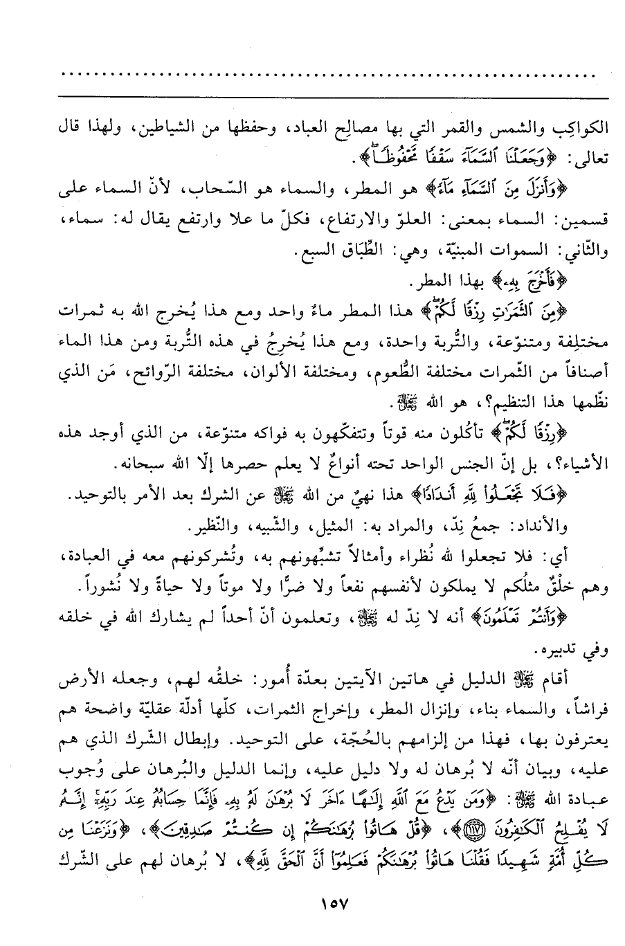 أقام سبحانه وتعالى الدليل في هاتين الآيتين بعدّة أُمور: خلقُه لهم، وجعله الأرض فراشاً، والسماء بناءً، وإنزال المطر، وإخراج الثمرات، كلّها أدلّة عقليّة واضحة هم يعترفون بها، فهذا من إلزامهم بالحُجّة، على التوحيد. وإبطال الشّرك الذي هم عليه، وبيان أنّه لا بُرهان له ولا دليل عليه، وإنما الدليل والبُرهان على وُجوب عبادة الله سبحانه وتعالى: {وَمَنْ يَدْعُ مَعَ اللهِ إِلَهاً آخَرَ لا بُرْهَانَ لَهُ بِهِ فَإِنَّمَا حِسَابُهُ عِنْدَ رَبِّهِ إِنَّهُ لا يُفْلِحُ الْكَافِرُونَ (117) } ، {قُلْ هَاتُوا بُرْهَانَكُمْ إِنْ كُنْتُمْ صَادِقِينَ} ، {وَنَزَعْنَا مِنْ كُلِّ أُمَّةٍ شَهِيداً فَقُلْنَا هَاتُوا بُرْهَانَكُمْ فَعَلِمُوا أَنَّ الْحَقَّ لِلَّهِ} لا بُرهان لهم على الشّرك