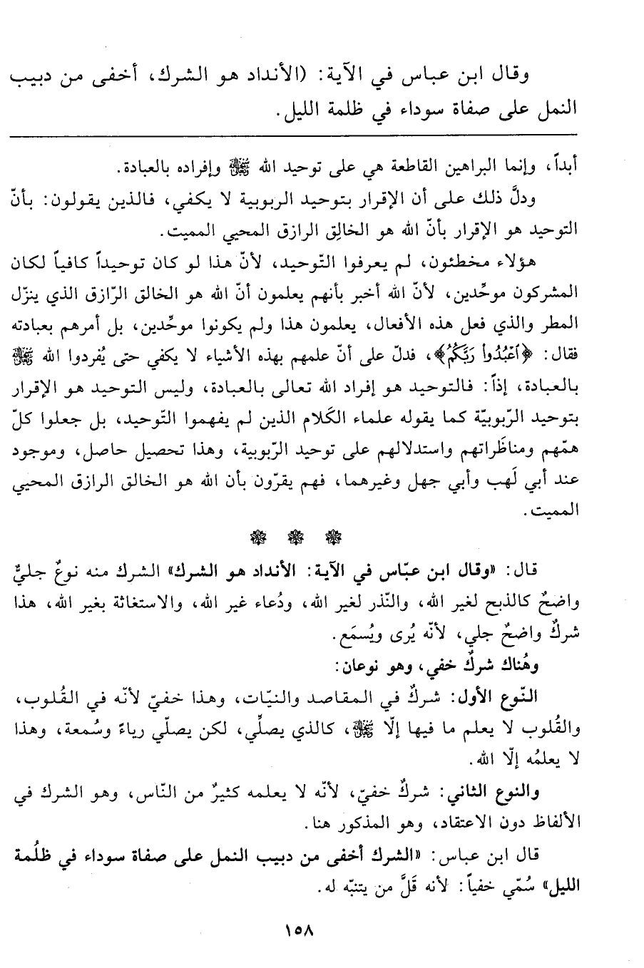 قال: "وقال ابن عبّاس في الآية: الأنداد هو الشرك" الشرك منه نوعٌ جليٌّ واضحٌ كالذبح لغير الله، والنّذر لغير الله، ودُعاء غير الله، والاستغاثة بغير الله، هذا شرك واضحٌ جلي، لأنّه يُرى ويُسمَع.