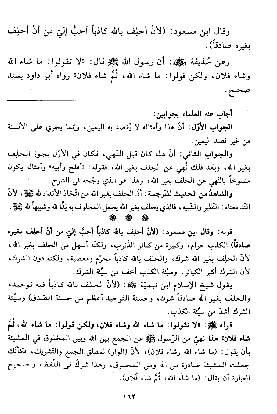 قوله صَلَّى اللَّهُ عَلَيْهِ وَسَلَّمَ: "لا تقولوا: ما شاء الله وشاء فلان، ولكن قولوا: ما شاء الله، ثُمَّ شاء فلان" هذا نهيٌ من الرّسول صَلَّى اللَّهُ عَلَيْهِ وَسَلَّمَ عن الجمع بين الله وبين المخلوق في المشيئة بأن يقول: "ما شاء الله وشاء فلان"، لأنّ (الواو) لمطلق الجمع والتّشريك، فكأنّك جعلت المشيئة صادرة من الله ومن المخلوق، وهذا شركٌ في اللّفظ، وتصحيح العبارة أن يقال: "ما شاء الله، ثُمَّ شاء فُلان".
