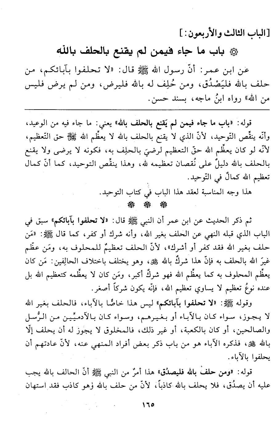 ثم ذكر الحديث عن ابن عمر أن النبي صَلَّى اللَّهُ عَلَيْهِ وَسَلَّمَ قال: "لا تحلفوا بآبائكم" سبق في الباب الذي قبله النهي عن الحلف بغير الله، وأنه شرك أو كفر، كما قال صَلَّى اللَّهُ عَلَيْهِ وَسَلَّمَ: "مَن حلف بغير الله فقد كفر أو أشرك"، لأنّ الحلف تعظيمٌ للمحلوف به، ومَن عظّم غيرَ الله بالحلف به فإنّ هذا شركٌ بالله عزّ وجلّ، وهو يختلف باختلاف الحالفين: من كان يعظِّم المحلوف به كما يعظِّم الله فهو شركٌ أكبر، ومن كان لا يعظِّمه كتعظيم الله بل عنده نوعُ تعظيم لا يساوي تعظيم الله، فإنّه يكون شركاً أصغر.