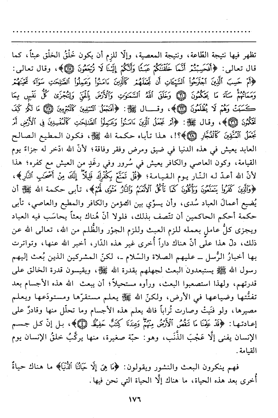 تظهر فيها نتيجة الطّاعة، ونتيجة المعصية، وإلاّ للزِم أن يكون خَلْقُ الخلْق عبثاً، كما قال تعالى: {أَفَحَسِبْتُمْ أَنَّمَا خَلَقْنَاكُمْ عَبَثاً وَأَنَّكُمْ إِلَيْنَا لا تُرْجَعُونَ (115) } ، وقال تعالى: {أَمْ حَسِبَ الَّذِينَ اجْتَرَحُوا السَّيِّئَاتِ أَنْ نَجْعَلَهُمْ كَالَّذِينَ آمَنُوا وَعَمِلُوا الصَّالِحَاتِ سَوَاءً مَحْيَاهُمْ وَمَمَاتُهُمْ سَاءَ مَا يَحْكُمُونَ (21) وَخَلَقَ اللهُ السَّمَاوَاتِ وَالْأَرْضَ بِالْحَقِّ وَلِتُجْزَى كُلُّ نَفْسٍ بِمَا كَسَبَتْ وَهُمْ لا يُظْلَمُونَ (22) } ، وقال سبحانه وتعالى: {أَفَنَجْعَلُ الْمُسْلِمِينَ كَالْمُجْرِمِينَ (35) مَا لَكُمْ كَيْفَ تَحْكُمُونَ (36) } ، وقال سبحانه وتعالى: {أَمْ نَجْعَلُ الَّذِينَ آمَنُوا وَعَمِلُوا الصَّالِحَاتِ كَالْمُفْسِدِينَ فِي الْأَرْضِ أَمْ نَجْعَلُ الْمُتَّقِينَ كَالْفُجَّارِ (28) } ؟ ، هذا تأباه حكمة الله سبحانه وتعالى، فكون المطيع الصالح العابد يعيش في هذه الدنيا في ضيق ومرض وفقر وفاقة؛ لأنّ الله ادّخر له جزاءً يوم القيامة، وكون العاصي والكافر يعيش في سُرور وفي رغَدٍ من العيش مع كفره؛ هذا لأنّ الله أعدّ له النّار يوم القيامة؛ {قُلْ تَمَتَّعْ بِكُفْرِكَ قَلِيلاً إِنَّكَ مِنْ أَصْحَابِ النَّارِ} ، {وَالَّذِينَ كَفَرُوا يَتَمَتَّعُونَ وَيَأْكُلُونَ كَمَا تَأْكُلُ الْأَنْعَامُ وَالنَّارُ مَثْوىً لَهُمْ} ، تأبى حكمة الله سبحانه وتعالى أن يُضيع أعمال العباد سُدى، وأن يسوِّي بين المؤمن والكافر والمطيع والعاصي، تأبى حكمة أحكم الحاكمين أن تتّصف بذلك، فلولا أنّ هناك بعثاً يحاسَب فيه العباد ويجزى كلُّ عامل بعمله للزم العبث وللزم الجور والظُّلم من الله، تعالى الله عن ذلك، دلّ هذا على أن هناك داراً أُخرى غير هذه الدّار، أخبر الله عنها، وتواترت بها أخبارُ الرُّسل- عليهم الصلاة والسّلام-، لكنّ المشركين الذين بُعث إليهم رسول الله صَلَّى اللَّهُ عَلَيْهِ وَسَلَّمَ يستبعدون البعث لجهلهم بقدرة الله سبحانه وتعالى، ويقيسون قدرة الخالق على قدرتهم، ولهذا استصعبوا البعث، ورأوه مستحيلاً؛ أن يبعث الله هذه الأجسام بعد تفتُّتها وضياعها في الأرض، ولكنّ الله سبحانه وتعالى يعلم مستقرّها ومستودَعها ويعلم مصيرها، ولو فنَيتْ وصارت تُراباً فالله يعلم هذه الأجسام وما تحلّل منها وقادرٌ على إعادتها: {قَدْ عَلِمْنَا مَا تَنْقُصُ الْأَرْضُ مِنْهُمْ وَعِنْدَنَا كِتَابٌ حَفِيظٌ (4) } ، بل إنّ كل جسم الإنسان يفنى إلاَّ عَجْبَ الذَّنب، وهو: حبّة صغيرة، منها يركَّبُ خلقُ الإنسان يوم القيامة.