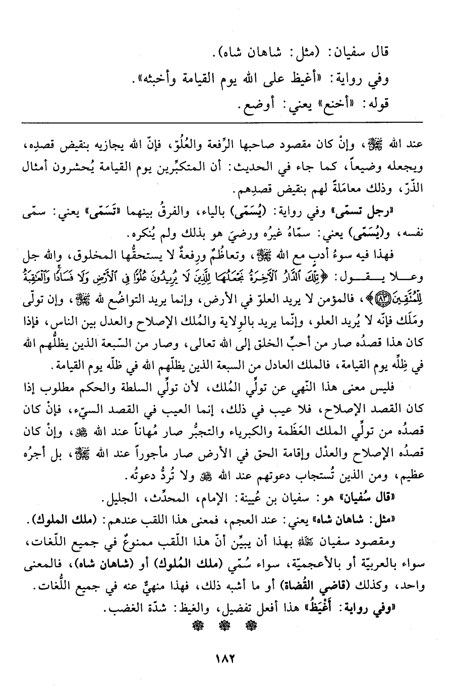 ومقصود سفيان رحمه الله بهذا أن يبيِّن أنّ هذا اللّقب ممنوعٌ في جميع اللّغات، سواء بالعربيّة أو بالأعجميّة، سواء سُمّي "ملك المُلوك" أو "شاهان شاه"، فالمعنى واحد، وكذلك "قاضي القُضاة" أو ما أشبه ذلك، فهذا منهيٌّ عنه في جميع اللُّغات.