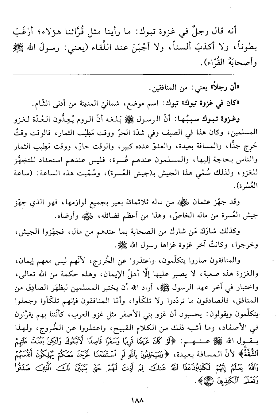والمنافقون صاروا يتكلّمون، واعتذروا عن الخُروج، لأنّهم ليس معهم إيمان، والغزوة هذه صعبة، لا يصبر عليها إلاَّ أهلُ الإيمان، وهذه حكمة من الله تعالى، واختبار في آخر عهد الرسول صَلَّى اللَّهُ عَلَيْهِ وَسَلَّمَ، أراد الله أن يختبر المسلمين ليظهَر الصادِق من المنافق، فالصادقون ما تردّدوا ولا تلكّأوا، وأمّا المنافقون فإنهم تلكّأوا وجعلوا يتكلّمون ويقولون: يحسبون أن غزو بني الأصفر مثل غزو العرب، كأنّنا بهم يقرَّنون في الأصفاد، وما أشبه ذلك من الكلام القبيح، واعتذروا عن الخُروج، ولهذا يقول الله سبحانه وتعالى عنهم: {لَوْ كَانَ عَرَضاً قَرِيباً وَسَفَراً قَاصِداً لَاتَّبَعُوكَ وَلَكِنْ بَعُدَتْ عَلَيْهِمُ الشُّقَّةُ} لأنّ المسافة بعيدة، {وَسَيَحْلِفُونَ بِاللهِ لَوِ اسْتَطَعْنَا لَخَرَجْنَا مَعَكُمْ يُهْلِكُونَ أَنْفُسَهُمْ وَاللهُ يَعْلَمُ إِنَّهُمْ لَكَاذِبُونَ * عَفَا اللهُ عَنْكَ لِمَ أَذِنْتَ لَهُمْ حَتَّى يَتَبَيَّنَ لَكَ الَّذِينَ صَدَقُوا وَتَعْلَمَ الْكَاذِبِينَ (43) } .