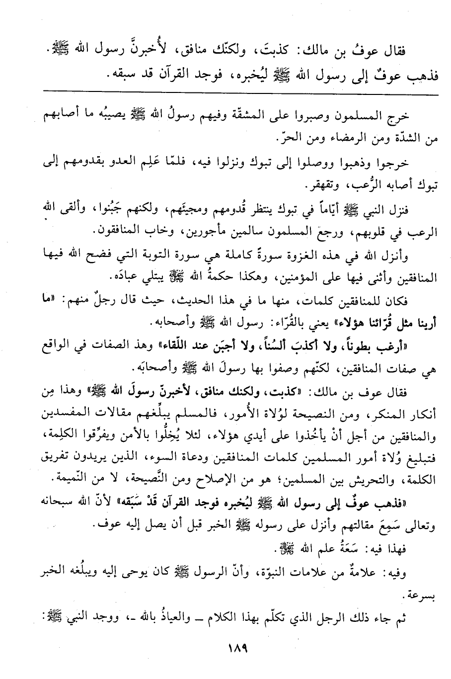 فقال عوفُ بن مالك: كذبتَ، ولكنّك منافق، لأُخبرنَّ رسول الله صَلَّى اللَّهُ عَلَيْهِ وَسَلَّمَ. فذهب عوفُ إلى رسول الله صَلَّى اللَّهُ عَلَيْهِ وَسَلَّمَ ليُخبره، فوجد القرآن قد سبقه.