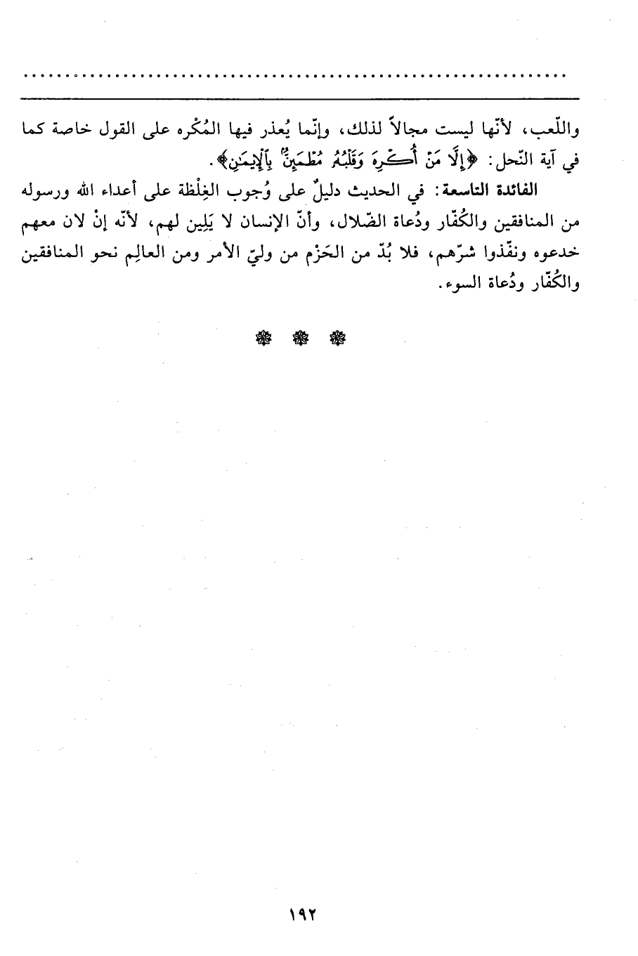الفائدة التاسعة: في الحديث دليلٌ على وُجوب الغِلْظة على أعداء الله ورسوله من المنافقين والكُفّار ودُعاة الضّلال، وأنّ الإنسان لا يَلِين لهم، لأنّه إنْ لان معهم خدعوه ونفّذوا شرّهم، فلا بُدّ من الحَزْم من وليّ الأمر ومن العالِم نحو المنافقين والكُفّار ودُعاة السوء.