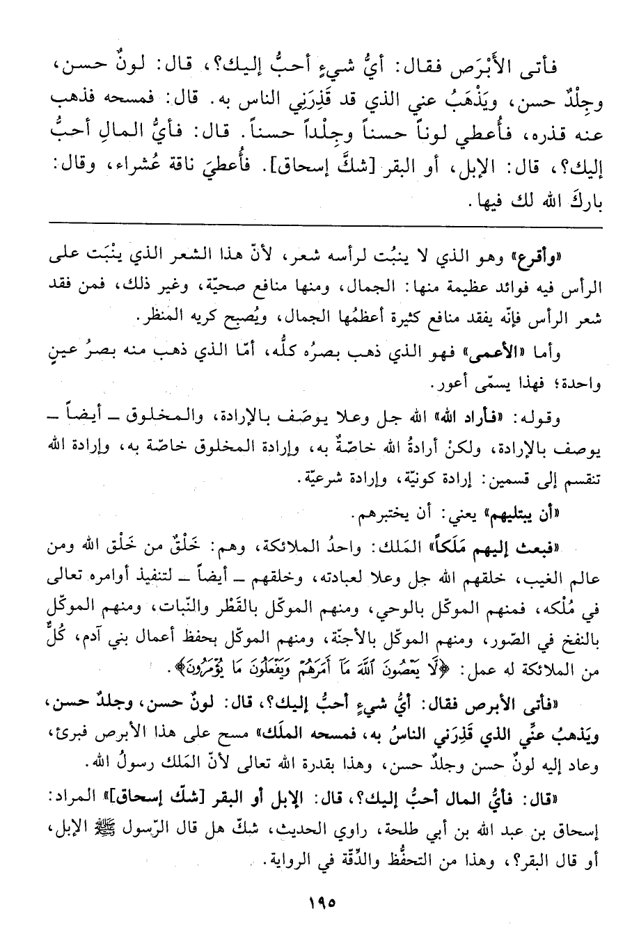 فأتى الأَبْرَص فقال: أيُّ شيءٍ أحبُّ إليك؟، قال: لونٌ حسن، وجِلْدٌ حسن، ويَذْهَبُ عني الذي قد قَذِرَنِي النّاس به. قال: فمسحه فذهب عنه قذره، فأُعطي لوناً حسناً وجِلْداً حسناً. قال: فأيُّ المالِ أحبُّ إليك؟، قال: الإبل، أو البقر [شكَّ إسحاق] . فأُعطيَ ناقة عُشراء، وقال: باركَ الله لك فيها.