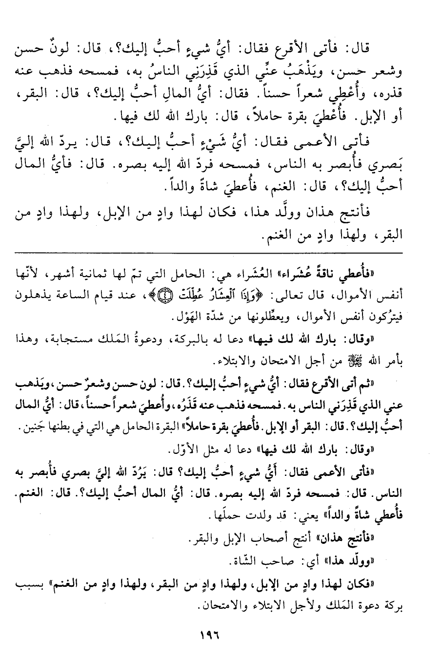 "ثم أيُّ شيءٍ أحبُّ إليك؟، قال: لونٌ حسن وشعر حسن، ويَذْهَبُ عني الذي قد قَذِرَنِي النّاس به، فمسحه فذهب عنه قذره، وأُعطِي شعراً حسناً. فقال: أيُّ المالِ أحبُّ إليك؟، قال: البقر، أو الإبل. فأُعْطيَ بقرة حاملاً" البقرة الحامل هي التي في بطنها جَنين.