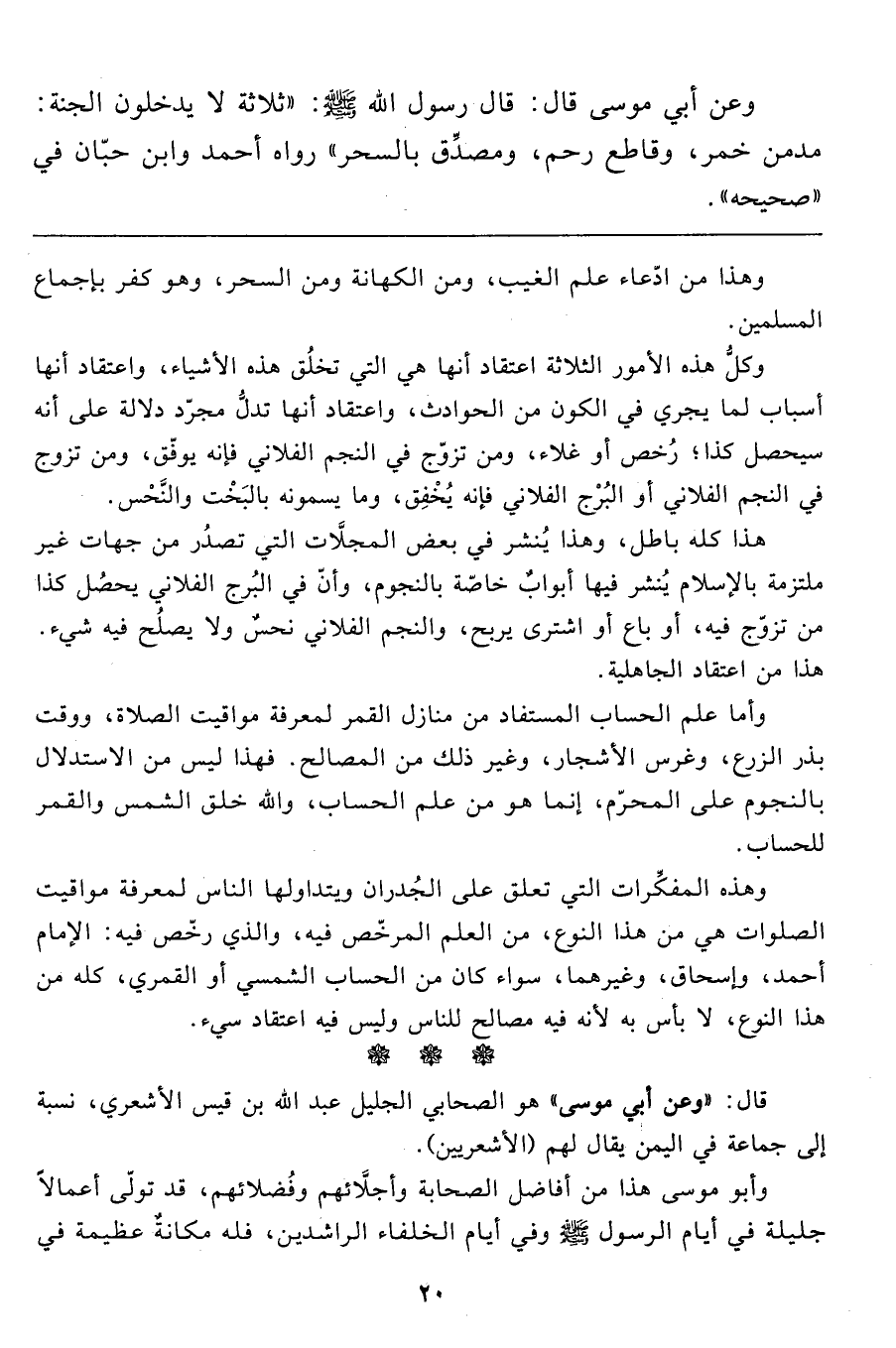 وعن أبي موسى قال: قال رسول الله صَلَّى اللَّهُ عَلَيْهِ وَسَلَّمَ: "ثلاثة لا يدخلون الجنة: مدمن خمر، وقاطع رحم، ومصدِّق بالسحر" رواه أحمد وابن حبّان في "صحيحه".
