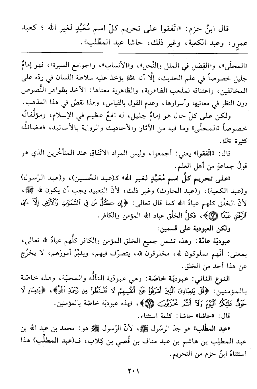 "على تحريم كلِّ اسم مُعَبَّدٍ لغير الله" كـ (عبد الحُسين) ، و (عبد الرّسول) و (عبد الكعبة) ، و (عبد الحارث) وغير ذلك، لأنّ التعبيد يجب أن يكون لله سبحانه وتعالى، لأنّ الخلْق كلهم عبادُ الله كما قال تعالى: {إِنْ كُلُّ مَنْ فِي السَّمَاوَاتِ وَالْأَرْضِ إِلَّا آتِي الرَّحْمَنِ عَبْداً (93) } ، فكلُّ الخلق عباد الله المؤمن والكافر.