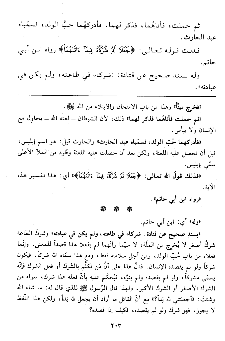 "بسند صحيح عن قتادة: شركاء في طاعته، ولم يكن في عبادته" وشركُ الطاعة شركٌ أصغر لا يُخرِج من الملّة، لاسيّما وأنّهما لم يفعلا هذا قصداً للمعنى، وإنّما فعلاه من باب حُبّ الولد، ومن أجل سلامته فقط، ومع هذا سمّاه الله شركاً، فيكون شركاً ولو لم يقصده الإنسان. فدلَّ هذا على أنَّ مَن تكلَّم بالشّرك أو فعل الشرك فإنّه يسمّى مشركاً، ولو لم يقصده ولم ينوِّه، فيُحكَم عليه بأنّ فعله هذا شرك، سواء من الشرك الأصغر أو الشرك الأكبر، ولهذا قال الرّسول صَلَّى اللَّهُ عَلَيْهِ وَسَلَّمَ للذي قال له: ما شاء الله وشئتَ: "أجعلتني لله نِدًّا؟ " مع أنّ القائل ما أراد أن يجعل لله نِدًّا، ولكن هذا اللّفظ لا يجوز، فهو شرك ولو لم يقصده، فكيف إذا قصده؟