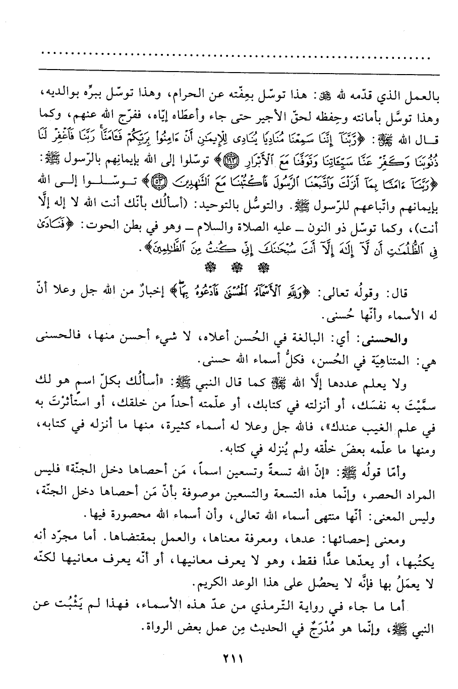 وأمّا قولُه صَلَّى اللَّهُ عَلَيْهِ وَسَلَّمَ: "إنّ الله تسعةً وتسعين اسماً، مَن أحصاها دخل الجنّة" فليس المراد الحصر، وإنّما هذه التسعة والتسعين موصوفة بأنّ مَن أحصاها دخل الجنّة، وليس المعنى: أنّها منتهى أسماء الله تعالى، وأن أسماء الله محصورة فيها.