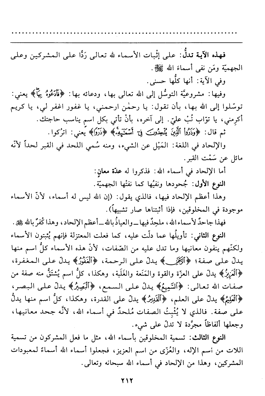 النوع الثاني: تأويلُها عما دلّت عليه، كما فعلت المعتزلة فإنهم يُثبتون الأسماء ولكنّهم ينفون معانيها وما تدل عليه من الصّفات، لأنّ هذه الأسماء كلُّ اسم منها يدلّ على صفة؛ {الرحمن} يدلّ على الرحمة، {الغفور} يدلّ على المغفرة، {العزيز} يدلّ على العزّة والقوة والمَنَعة والغَلَبة، وهكذا، كلُّ اسم يُشتَقُّ منه صفة من صفات الله تعالى: {السميع} يدلّ على السمع، {البصير} يدلّ على البصر، {العليم} يدلّ على العلم، {القدير} يدلّ على القدرة، وهكذا، كلُّ اسم منها يدلُّ على صفة. فالذي لا يُثْبِتُ الصّفات مُلحدٌ في أسماء الله، لأنّه جحد معانيها، وجعلها ألفاظاً مجرَّدة لا تدلّ على شيء.