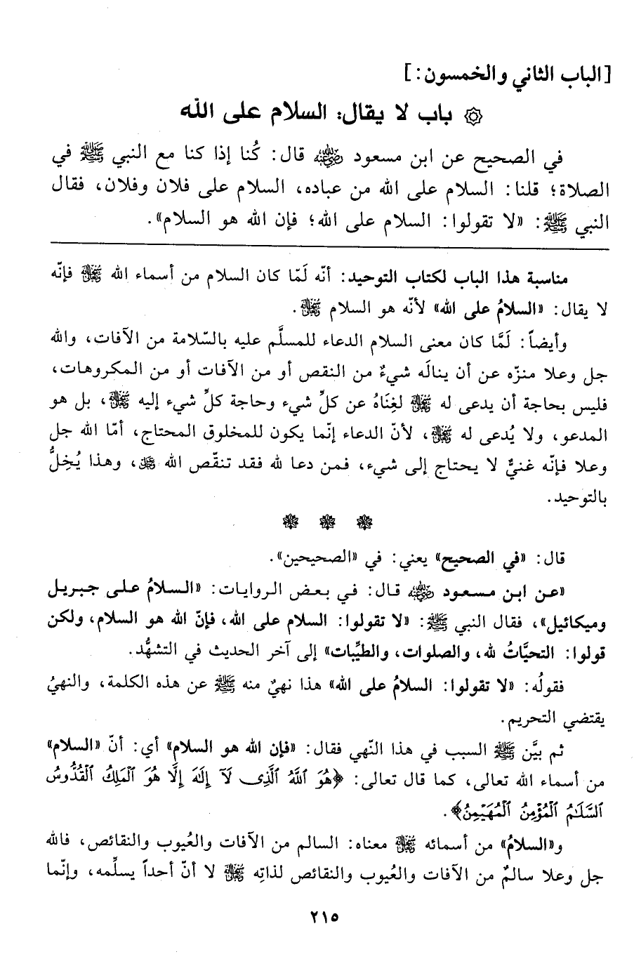 مناسبة هذا الباب الكتاب التّوحيد: أنّه لَمّا كان السلام من أسماء الله سبحانه وتعالى فإنّه لا يقال: "السلامُ على الله" لأنّه هو السلام سبحانه وتعالى".