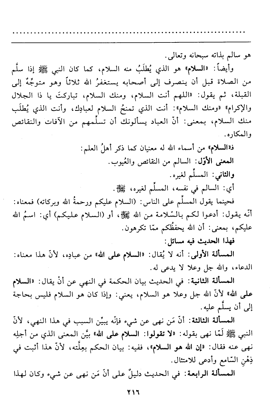 المسألة الأولى: أنه لا يُقال: "السلام على الله" من عبادِه، لأنّ هذا معناه: الدعاء، والله جل وعلا لا يدعى له.